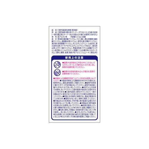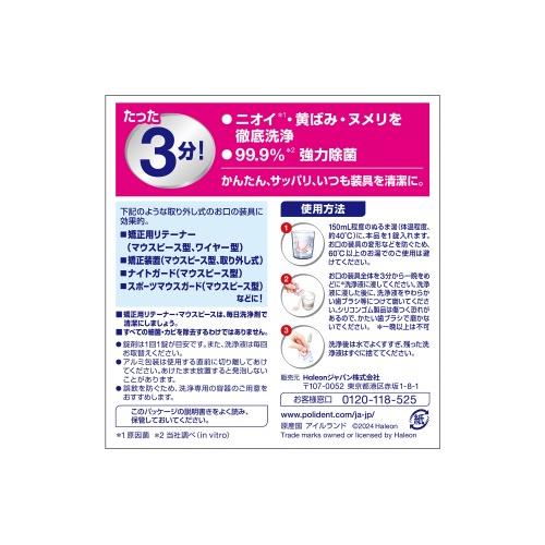 リニューアルに伴いパッケージ・内容等予告なく変更する場合がございます。予めご了承ください。 名 称 ポリデント デンタルラボ マウスピース・矯正用リテーナー用洗浄剤 内容量 48錠 特 徴 ◆除菌率99.9%。頑固なヨゴレを徹底洗浄、除菌。 ◆着色汚れ、ニオイ(原因菌)をとり、スッキリ、清潔に。 ・矯正用リテーナー(マウスピース型、ワイヤー型) ・矯正装置(マウスピース型、取り外し式) ・ナイトガード(マウスピース型) ・スポーツマウスガード(マウスピース型) などに! 材 質 重炭酸ナトリウム、クエン酸、過ホウ酸ナトリウム、過硫酸カリウム、メタリン酸ナトリウム、メタケイ酸ナトリウム、ピロリン酸カリウム、炭酸ナトリウム、ラウリル硫酸ナトリウム、テトラアセチルエチレンジアミン、安息香酸ナトリウム、ビニルピロリドン/酢酸ビニル共重合体、セルロースガム、香料、酵素、亜硝酸ナトリウム、ポリジメチルシロキサン、青色1号アルミニウムレーキ、青色2号 使用方法 1.150mL程度のぬるま湯(約40度)に、本品を1錠入れます。 2.お口の装具全体を5分以上洗浄液に浸してください。洗浄液に浸した後に、洗浄液を市販の歯ブラシ等につけて磨いてください。シリコンゴム製品は傷つく恐れがあるので、歯ブラシで磨かないでください。 3.洗浄後は水でよくすすぎ、残った洗浄液はすぐに捨ててください。 区 分 口腔内装具洗浄剤/アイルランド製 ご注意 ◆本品記載の使用法、使用上の注意をよくお読みの上ご使用下さい。 お客様相談窓口 電話:0120-118-525 広告文責 株式会社ツルハグループマーチャンダイジング カスタマーセンター 047-409-4023 JANコード:4987246673051