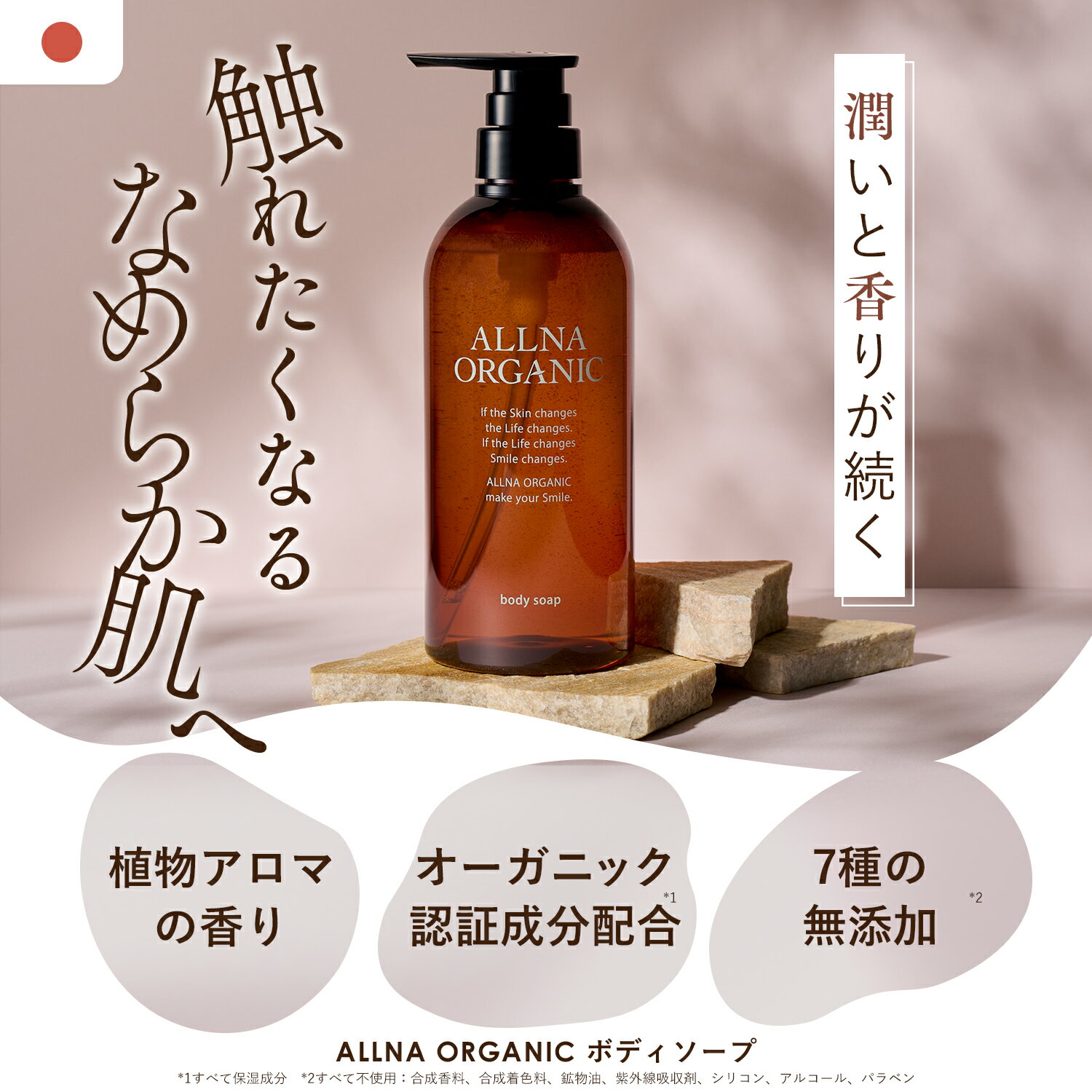 【 植物エキス(保湿成分)たっぷり♪ 】植物由来美容エキス25種(保湿成分)を贅沢配合した女性用ボディーソープで、いい香りがします。【 美しさも追求! 】4大美容成分で洗い上がりもしっとり。【 心を満たす自然の香り 】合成香料を使わず、精油にこだわりブレンドしました。ティーツリー・ラベンダー・オレンジを基調とした植物精油(オーガニック)でな香りに仕上がりました。【 安定の日本製! 】企画、製造、販売全てが日本人、日本法人であり品質にこれでもかとこだわっています。 ISO9001品質基準の生産管理です。*1:合成香料不使用、合成着色料不使用、ノンパラベン、鉱物油不使用、石油由来界面活性剤不使用、ノンシリコン、ノンエタノール *2 *3:保湿商品名 ALLNA ORGANIC ( オルナ オーガニック ) ボディソープ 商品区分 化粧品 容量 450ml 成分水、ラウレス硫酸Na、コカミドプロピルベタイン、コカミドDEA、グリセリン、ペンチレングリコール、水溶性コラーゲン、加水分解コラーゲン、加水分解ヒアルロン酸、ヒアルロン酸Na、セラミドNP、サクシノイルアテロコラーゲン、シア脂、ラベンダー油、オレンジ油、ティーツリー葉油、ローマカミツレ花油、オリーブ果実油、マンダリンオレンジ果皮エキス、ユズ果実エキス、カミツレ花エキス、ユキノシタエキス、ラベンダー花エキス、ボタンエキス、ローズマリー葉エキス、ツボクサエキス、オウゴン根エキス、イタドリ根エキス、トウキンセンカ花エキス、ソメイヨシノ葉エキス、ノイバラ果実エキス、カンゾウ根エキス、チャ葉エキス、アルテア根エキス、イザヨイバラエキス、セイヨウオトギリソウ花/葉/茎エキス、フユボダイジュ花エキス、ヤグルマギク花エキス、ローマカミツレ花エキス、ヒメフウロエキス、キュウリ果実エキス、キハダ樹皮エキス、グリチルリチン酸2K、カラメル、塩化Na、アスコルビルグルコシド、アセチルヒアルロン酸Na、パルミチン酸アスコルビルリン酸3Na、リン酸アスコルビルMg、クエン酸、テトラヘキシルデカン酸アスコルビル、アルガニアスピノサ核油、ヒアルロン酸クロスポリマーNa、BG、フェノキシエタノール 生産国 日本 広告文責 イルミルド株式会社:06-7638-6623 使用上の注意 ・使用中や使用後に赤み、はれ、かゆみ、刺激、色抜け(白斑等)や黒ずみ等の異常が現れた時は、使用を中止し、皮膚科専門医等へご相談されることをおすすめします。・お肌に異常が生じていないかよく注意してご使用ください。・傷、はれもの、湿疹等異常のある部位にはご使用にならないでください。・目に入ったときは、直ちに洗い流してください。・極端に高温または低温の場所、直射日光のあたる場所には保管しないでください。・天然由来成分を配合しておりますので、変色、沈殿等が生じる場合がありますが品質には問題ございません。・乳幼児の手の届かないところに保管してください。 使用方法 タオルやスポンジに適量とり、水またはぬるま湯を加えて泡立ててお使いください。 関連キーワード 汚れ 肌 潤い 洗い上がり 無添加 オーガニック オーガニックボディソープ オーガニックシャンプー ボディシャンプー セラミド コラーゲン ビタミンc ヒアルロン酸 合成香料不使用 ティーツリー ラベンダー オレンジ 保湿 泡 いい匂い いい香り 乾燥肌 ブランド プロ メンズ 10代 20代 30代 40代 効果 女性 男性 毛穴 ケア おすすめ ランキング 口コミ レディース 安い やすい 母の日 プレゼント ギフト 父の日 誕生日 クリスマス 天然 ダメージ クオリティ 美容 ナチュラル 無香料 コスパ 最強 オススメ 敏感肌 乾燥 日本製 おしゃれ 送料無料 売れ筋 セット お試し スキンケア 除外キーワード※以下を目的としておりません プチプラ トラベル トラベルセット デパコス 韓国 ドラッグストア 市販 薬局