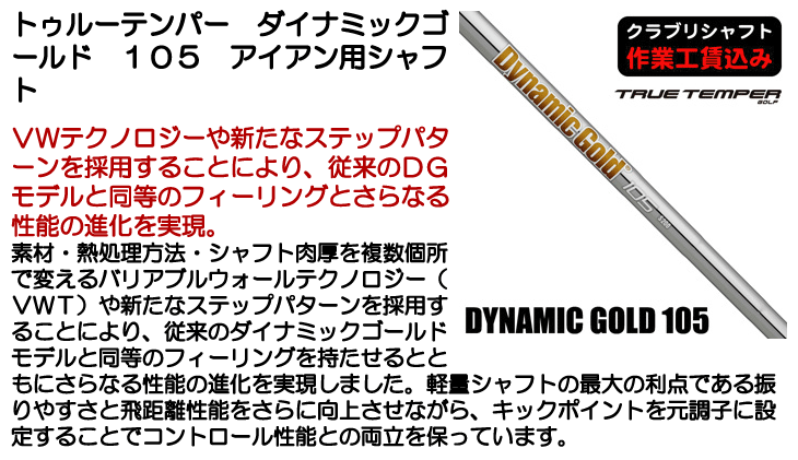 素材・熱処理方法・シャフト肉厚を複数個所で変えるバリアブルウォールテクノロジー(VWT)や新たなステップパターンを採用することにより、従来のダイナミックゴールドモデルと同等のフィーリングを持たせるとともにさらなる性能の進化を実現しました。軽量シャフトの最大の利点である振りやすさと飛距離性能をさらに向上させながら、キックポイントを元調子に設定することでコントロール性能との両立を保っています。 ※お客様のクラブを当店でお預かりし、シャフト交換作業を行なってお客様にお戻しする「リシャフト」です。シャフト単体の販売ではありませんのでご注意ください。 ●クラブ集荷便のご注文はこちらから ●互換スリーブ(弾道調整機能付き)のご注文はこちらから■モデル名 DYNAMIC GOLD 105 ■ティップ テーパータイプ ■番手 #3 - #PW ■フレックス R300 / S200 / X100 ■製品長(inch) 41.0 - 37.0 ■Tip径(mm) 9.00 ■Butt径(mm) 15.25(R300) / 15.25(S200) / 15.37(X100) ■カット前重量(g) 101.0(R300) / 103.0(S200) / 105.0(X100) ■キックポイント 元調子