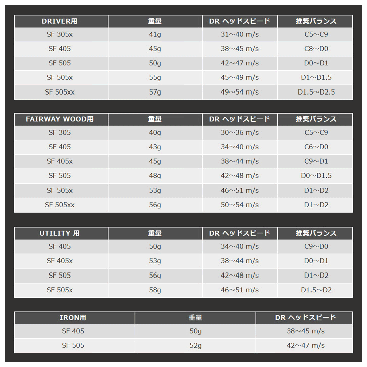 様々なスイングタイプに合わせてしなり幅やしなり戻りのタイミングを最適化するFLEX=自動調整設計を施しました。また、従来のシャフトよりも軽量化を図っており、振りやすさを向上させるとともに、プレーヤーの負担軽減にも貢献しています。柔らかいのに暴れない安定した挙動と軽量化により、ヘッドスピードをアップさせて大きな飛距離に導きます。 ※お客様のクラブを当店でお預かりし、シャフト交換作業を行なってお客様にお戻しする「リシャフト」です。シャフト単体の販売ではありませんのでご注意ください。 ●クラブ集荷便のご注文はこちらから ●互換スリーブ(弾道調整機能付き)のご注文はこちらから■モデル名 SF 305 SF 405 SF 405x SF 505 SF 505x SF 505xx ■シャフトカラー イエロー / ピンク×ブラック / レインボー ■製品長(inch) 43.0 ■重量(g) 40.0 43.0 45.0 48.0 53.0 56.0 ■Tip径(mm) 8.50