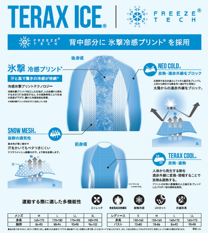 放熱&遮熱の「TERAX-COOL」と冷感プリントの「氷撃」のコラボ商品「TERAX-ICE」の長袖ハイネックアンダーウェアです。[機能]:放熱・遮熱効果(冷却機能)/吸汗速乾/ストレッチ/UVカット(UPF50+)/抗菌防臭[素材]:前身頃:ナイロン90%×ポリウレタン10%/後身頃中心部:ナイロン79%×ポリウレタン21%/脇:ポリエチレン62%×合成繊維20%(エラストオレフィン)×ナイロン18%/袖、襟:ナイロン86%×ポリウレタン14%
