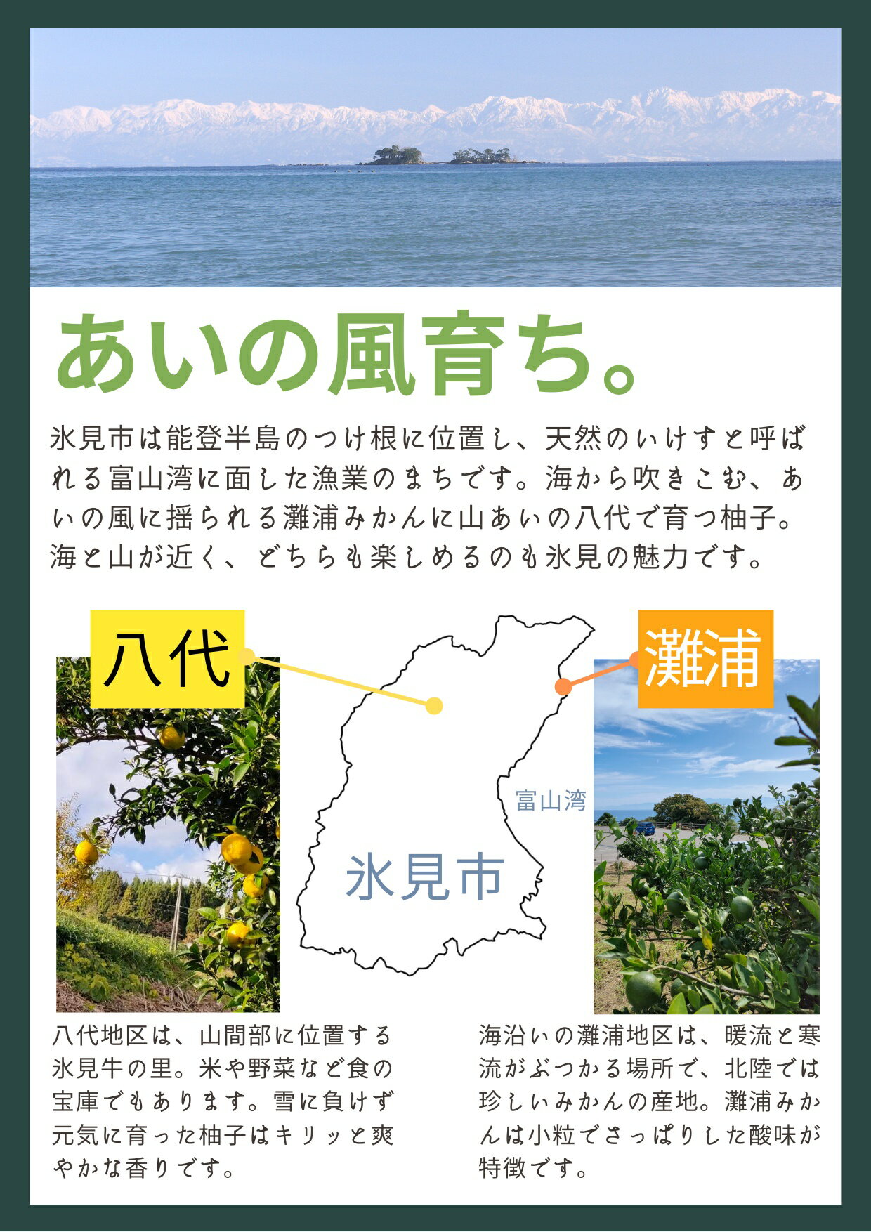 氷見産ゆずドリンクは、富山県氷見市の美しい自然に囲まれた八代地区で栽培された、農薬不使用の柚子を使用した贅沢なドリンクです。果実を丸ごと搾った柚子果汁を8%使用し、柚子本来の酸味をまろやかに、そして後味はすっきりと感じられるように仕上げました。 暑い日には冷やして爽やかなリフレッシュを、寒い日には温めて心地よいひとときをお楽しみいただけます。 氷見の自然が育んだ柚子の風味を、季節を問わずお楽しみください。 ※加熱の際は必ず耐熱容器に移し替えてください。商品名 ゆずドリンク 商品説明 果実を丸ごと搾った柚子果汁を8%使用し、柚子の酸味をまろやかに、後味はすっきり仕上げました。 原材料 ゆず果汁8%(ゆず(富山県氷見市産)、水あめ、砂糖、ぶどう糖果糖液糖 容量 100ml 賞味期間 製造日から1年6ヶ月