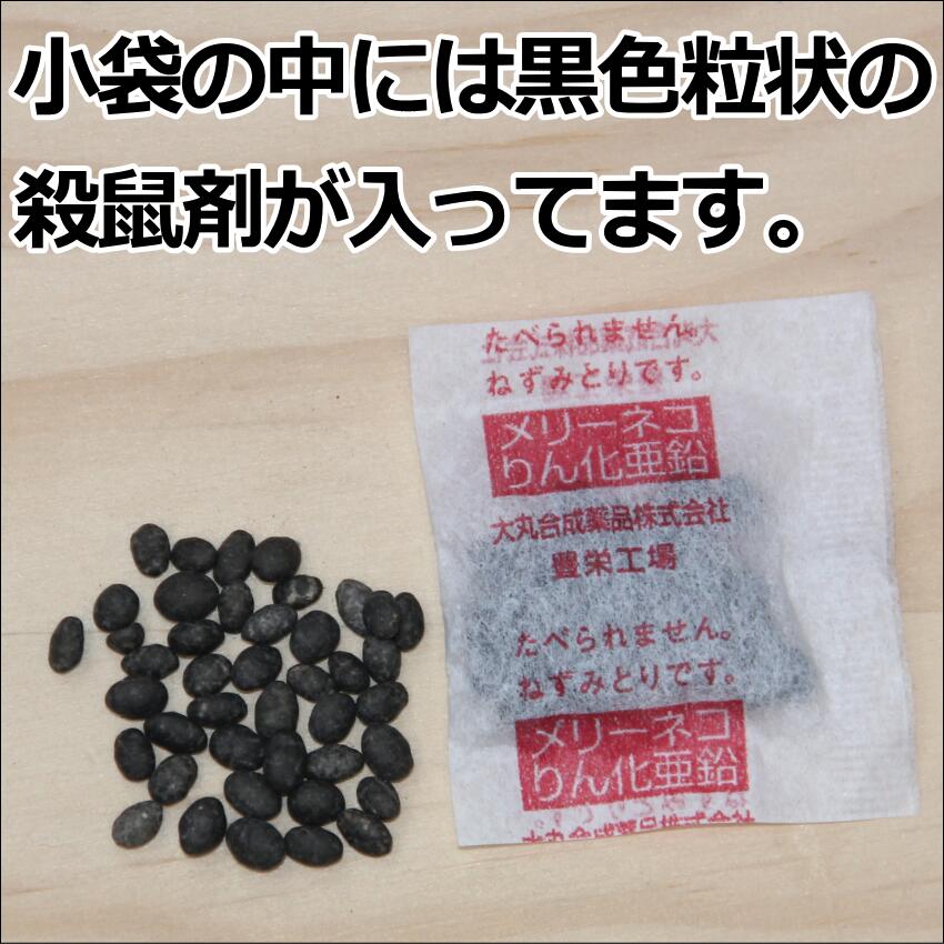 ▼ 製品特長 ・特殊加工により水濡れ又は雨雪にも崩れず、効力や喫食率は設置後2週間完全に持続します。 ・ネズミの好む餌を研究配合し、かつ堅さや形状、味等ネズミの習性に適合し、あらゆる種類の ネズミが忌避することなくよく食べます。 ・リン化亜鉛はリン化水素ガスを発生して急速に無毒化しますので、この薬剤を食べて死んだネ ズミを他の動物が食べても安全性が高く安心です。 ▼ 使用方法 ・農地では、ネズミが居ると思われる穴1ヶ所当りに2〜3粒を投入して下さい。 ・山林では、5〜10m間隔の格子状に1ヶ所当たり1〜2gをそのまま又は紙包みにして配置して下さい。 ・貯穀倉庫では、ネズミの通路より0.5〜1m離れた物陰に2〜3粒を数ヶ所配置して下さい。 ※製品ラベルに記載の使用上の注意を守り、正しくご使用下さい。 【使用上の注意】 ・野鼠(全農地、穀物倉庫、山林)以外には使用しないで下さい。 ・鉱物油等ネズミの忌避剤を付着させないこと。 ・使用後は密封し、農薬保管箱等に保存すること。 ・家畜や小児の誤って食べる恐れのある所では使用しないこと。 ・作業時は直接手にふれないようにゴム手袋などを用いて取り扱い、作業後及び直接身体に付 着したときは、石鹸でよく洗うこと。 ・処理後、食べ残しの薬剤は出来るだけ回収し、安全に処理すること。 【対象害獣・場所】 ・対象害獣:クマネズミ、ドブネズミ、ハツカネズミ、野ネズミなど ・対象場所:山林、全農地、貯穀・穀物倉庫などの鼠発生箇所 ▼ 商品内容 【製品名】メリーネコりん化亜鉛 【有効成分】リン化亜鉛(1%) 【剤 型】黒色粒状 【内容量】250包(袋入) 【販売元】大丸合成薬品株式会社 【適 用】農薬/農林省登録番号・第6605号 ※メリーネコりん化亜鉛は農薬であり、全農地及び貯穀倉庫、山林でのネズミ駆除目 的となります。 それ以外での場所では使用できませんのでご注意下さい。