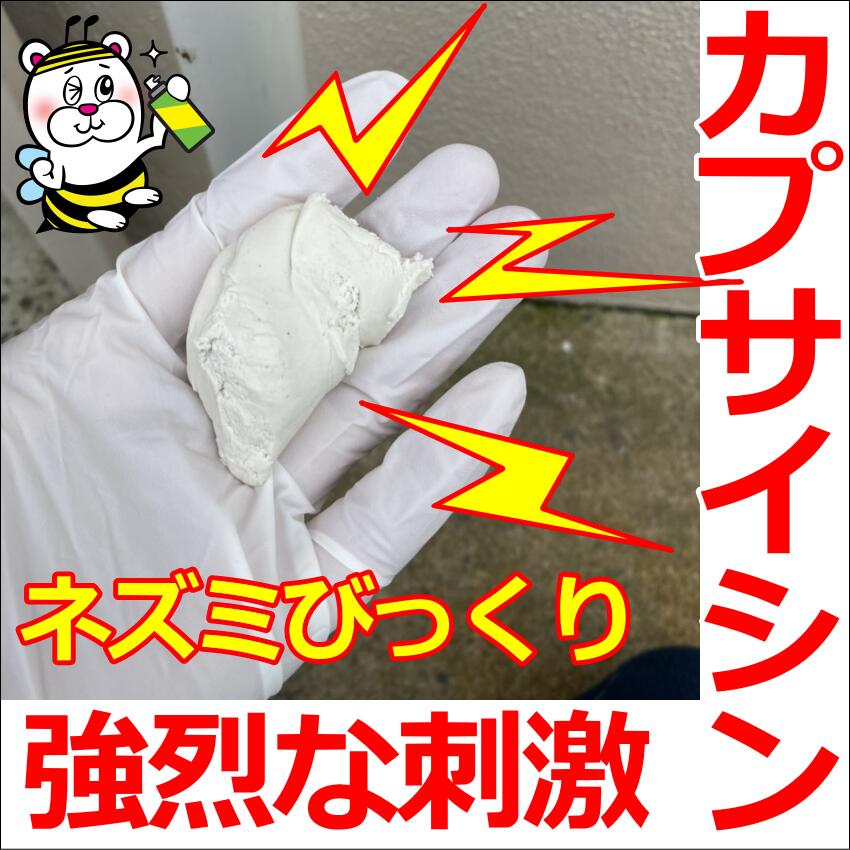 ▼ 製品特徴 ねずみの侵入口を塞ぐ! 本品はワサビ成分、とうがらし成分、ユーカリ成分が時間差的に効果を発揮します。 ネズミの出入り口や侵入経路でもある隙間を埋めるパテです。 防鼠(ぼうそ)作業の基本はネズミの侵入口を塞ぐ事です。 ねずみは辛味を感じてパテを齧る事が出来ません。 ねずみは食べ物などがあると壁や屋天井などの石膏ボード、木製のドアなどでも穴を開けて侵入してきます。何度隙間やクラックなどを埋めてもネズミに齧られて侵入される現場でお試し下さい。抜群の効果を発揮します! 優れた効力持続性 特にトウガラシ成分に含まれるカプサイシンは長期的効果を発揮します。有効期間は1年以上です。 作業が簡単! 粘土のような柔らかいパテなので簡単に隙間や穴を埋めれます。 ▼ 使用方法 施工の際には直接肌に触れないように手袋を着用して下さい。 ネズミが侵入したと見られる穴や隙間を忌避パテで埋めてください。 エアコンや配水管などの壁との隙間は格好の出入り口です。 大きな穴などは、金網やパンチングボードを利用して忌避パテで押さえて下さい。 床下換気口など大きな穴を塞ぐ場合は防虫ネットがお勧めです。 配管や配線などのねずみの齧り被害の場合は防鼠ビニルテープがお勧めです! ねずみの嫌がる成分をマイクロカプセル化して配合してあるので、配管や配線などを齧り被害から守ります! ねずみ対策!予防するには? 食べ物の管理を徹底しましょう!ネズミの餌となるものは、私達の食べ物は勿論、ペットフードから生花にいたるまで幅広くあります。まずはネズミの被害を防ぐには餌となる物を与えないことが重要となります。 整理整頓を心がけましょう!ネズミは私達の身近なものを利用して巣を作っています。単材になるものは、雑巾、ビニール類、ティッシュペーパー、布類など幅広くあります。日頃からネズミにつけいる隙を与えない事です。 ▼ 商品内容 製品名:ネズミ忌避パテ 成分:カプサイシン、ユーカリオイル配合 内容量:250g 販売元:株式会社SHIMADA