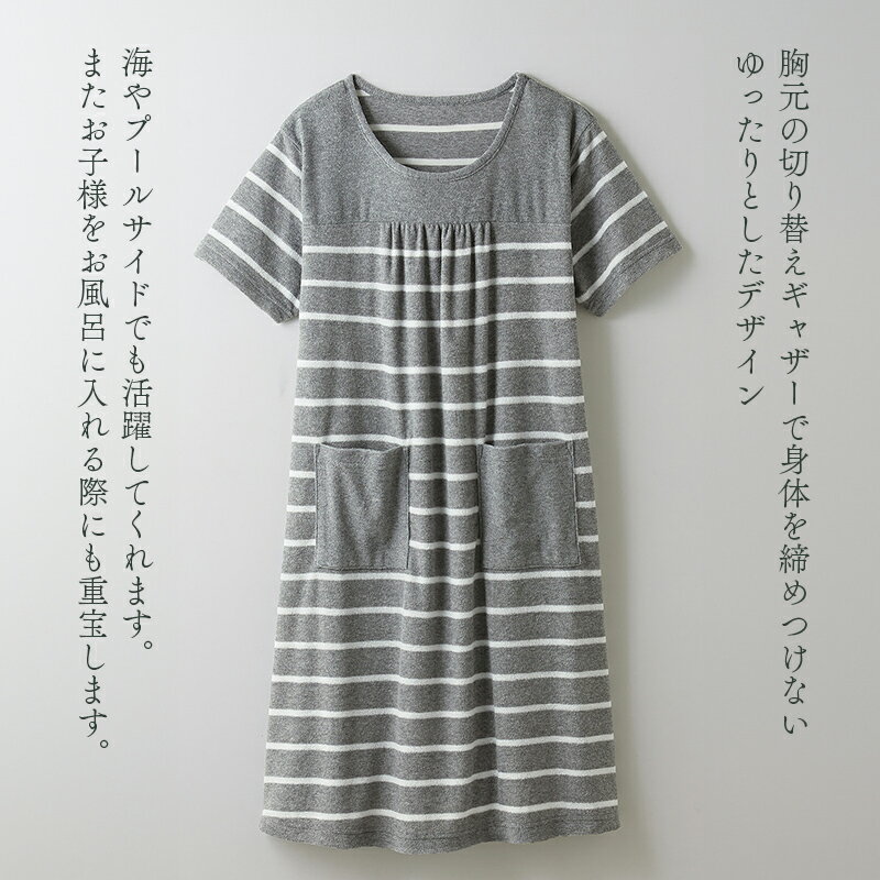 商品説明 胸元の切り替えギャザーで身体を締めつけないゆったりとしたデザイン。海やプールサイドでも活躍してくれます。またお子様をお風呂に入れる際にも重宝します。 サイズ 適応サイズM〜L :バスト79〜94cm 身長154〜162cmL〜LL:バスト93〜108cm 身長154〜162cm 素材 ポリエステル70%綿30% 生産国 中国 注意事項 洗濯の際、毛羽が出ることがありますので、洗濯ネットを使用し単品で洗濯してください。漂白剤のご使用、タンブラー乾燥はお避けください。長時間濡れたままにしておきますと色が移るおそれがありますのでご注意ください。においの気になる方は一度風通しの良い所で陰干ししてから使用してください。 ※写真の色味について商品画像は可能な限り実物のお色に近づけるよう努力しておりますが、 ご使用のモニター設定、閲覧する環境等により実際の商品と色が異なって見える場合がございます。 また、商品撮影時はスタジオの照明が当たっておりますので、その光線の当たり具合でも実際の商品と色が異なって見える場合がございます。 以上、予めご了承下さい。ご不明な色味などがございましたら、ご遠慮なくお問い合わせ下さい。