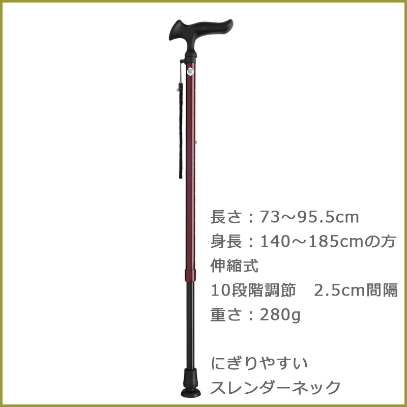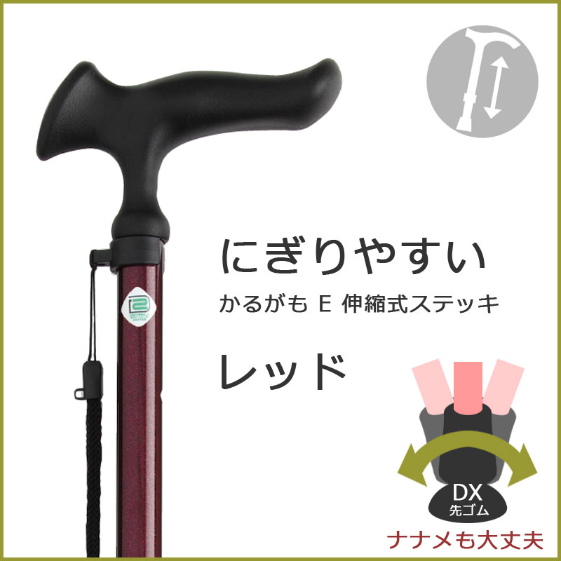 ● このステッキの特徴●スレンダーネック仕様グリップをにぎった時に指にかかるストレスを軽減させるため、グリップの首元を細くしたスレンダーネック。右手左手どちらの手にもなじむにぎりやすく疲れにくいオリジナルグリップです。グリップがしぼ加工によりすこし滑りにくくなっています。●DX先ゴムで安定!先ゴムの角度が接地面に合わせて変わるので、地面を突いた時に安定感があります。ななめから突いても安定感のあるDX先ゴム標準装備のステッキです。●ステッキの長さ調整可能範囲が広い【伸縮タイプ】です!●安心のSGマーク付き!商品名かるがも E 伸縮 S・M兼用色・柄レッド 杖の種類杖 伸縮杖 (長さ調節可!)調節機能10段階調節折りたたんだ時の大きさ(cm)グリップ(杖の手元)の素材ポリプロピレンシャフト(杖の棒部分)の素材アルミステッキの長さ(cm)73〜95.5適応身長(cm)【お使いになる方の身長】140〜185ステッキの重さ(g)280シャフト上部径サイズ(mm)【ストラップを付ける部分】19先ゴム径サイズ(mm) 16※先ゴムサイズは、先ゴム交換時に必要です。・ストラップ付・台湾製・SGマーク取得 ※モニタ環境により、実際の色味とは多少異なる場合がありますので予めご了承下さい。 ※パッケージデザイン等は予告なく変更されることがあります。 ※沖縄・離島は送料無料商品の場合でも【送料650円】頂きます。このステッキの交換用先ゴムの購入はこちら ↑有料ラッピングの購入はこちら↑