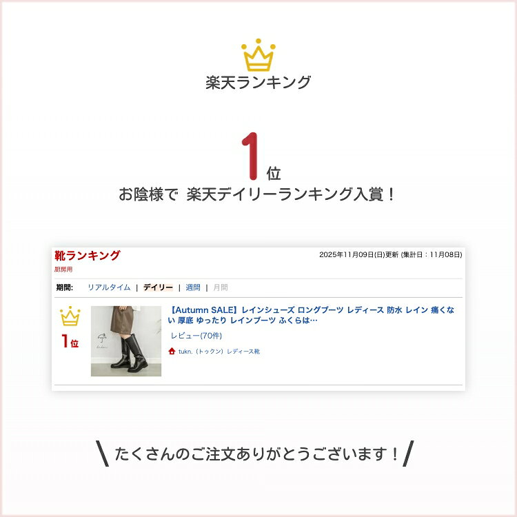 【当店トゥクンについて】 お客様に自信を持って、おすすめできる商品のみを取り扱い、 上質で安心安全な商品をコスパよくお客さまにお届けしたいと考えております。 ランキング上位商品、人気商品、お得な訳ありアウトレット商品、 最安商品、お買い得な値引き・セール商品、ポイント10倍商品等、 はお問い合わせが多く、 数に限りがありますので、 お早目にお買い求めください。 人気ブランド"147"さんとコラボした「シンプルロングブーツ」 すっきりと履けるインヒール仕様で、雨天兼用のブーツで、 ゆったり設計でできた1足。 小柄なかたもすっきりはける、インヒール使用のシンプルロングブーツで、 膝下丈でも小柄女性に合わせた丈に設定しています。 歩きやすくて疲れにくいのも嬉しいポイントとインスタグラムでも好評! 足に当たる部分はふんわり肌触りの良いジャージー素材を使用しているので、 履き心地の良い仕上がりに。 【商品詳細】 価格:14,900円(税込) サイズ展開:SS / S / M / L カラー:黒 ヒールの高さ:合計 6cm 素材:合皮 【おすすめのシーン】 通勤、ショッピング、デート、パーティー、冠婚葬祭など、あらゆるシーンに対応。 どんなコーディネートにも合わせやすく、1足で様々なシーンをカバーできます。 【以下のような方に多くご利用いただいております。】 年代: 20代 30代 40代 50代 60代 【贈り物に 】 お誕生日・記念日・クリスマス・出産祝い・母の日ギフト・敬老の日, ▼アイテム キーワード トゥンク ロングブーツ レインブーツ レインシューズ 雨靴 長靴 靴 インヒール レディース ジョッキー シンプル スタイリッシュ 6cm ヒール 完全防水 防水 歩きやすい 疲れにくい 蒸れにくい 大きいサイズ 小さいサイズ 雨 梅雨 雪 レイン 普段使い オフィス カジュアル 通学 通勤 学生 仕事 ビジネス 旅行 お出かけ ローヒール ブラック 黒 春 夏 秋 冬 春夏 秋冬 21.5cm 22.0cm 22.5cm 23cm 23.5cm 24cm 24.5cm SS S M L- shoes detail -  サイズ感   ぴったり  ◇ ◇ ◆ ◇ ◇  ゆったりめ  足 長 短 め ◇ ◇ ◇ ◆ ◇ 長 め 幅 狭 め ◇ ◇ ◇ ◆ ◇ 広 め 甲 低 め ◇ ◇ ◇ ◆ ◇ 高 め 重 さ 軽 め ◇ ◇ ◇ ◆ ◇ 重 め 素材感 柔らかめ ◇ ◇ ◆ ◇ ◇ 硬 め アイテムスペック (cm) サイズ 履き口 甲幅 底幅 筒丈 SS(21.5-22.0cm) 37.8 20.4 7.5 35.5 S(22.0-22.5cm) 39.0 21.1 7.6 37.5 M(23.0-23.5cm) 40.2 21.8 7.7 37.5 L(24.0-25.0cm) 41.4 22.5 7.8 37.5 ヒール高 ストーム高 3.0cm 2cm 素材 片足重さ 本体:合成皮革/底材:合成底・ラバー素材 約569g (計測サイズ:M) サイズ感 ※22.0/23.0/24.0の方で甲高な方はワンサイズアップされることをおすすめします。 注意事項 表記サイズと靴印字サイズが異なる場合がございますが、当ページ表記サイズを基準にご検討ください。 製造上、多少の傷や汚れ・縫製等の荒れなどが見られる場合がございますが、ハンドメイド商品のため、あらかじめご了承ください。 お使いのモニターの発色具合によって、実際のものと色が異なる場合がございます。 返品・交換については コチラ をご覧ください。 ご自身でキャンセルできる30分経過以降のキャンセルは基本的には承っておりませんが、 商品発送前であれば一度ご相談くださいませ。状況によっては対応が可能です。 ※発送する倉庫により対応が異なります。 ※楽天倉庫倉庫商品で「あす楽」でのご注文は30分以内であってもキャンセルできません。 キャンセルが間に合わない場合、¥1,194を頂戴いたします。