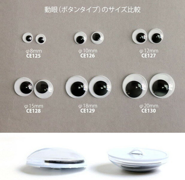 サイズ : Ф15mm入り数 : 1000個縫い付けボタンタイプ縫い付けタイプあみぐるみ、ぬいぐるみ手芸の目玉などによく使われるボタンです。目の位置や形で表情が変わります。納期 5〜6営業日※在庫状況によっては納期が遅れる場合がございます。予めご了承ください。透明なセルロイドのドームの中に、 黒目が入っています。キョロキョロとした目玉が付くだけで表情が豊かになります。