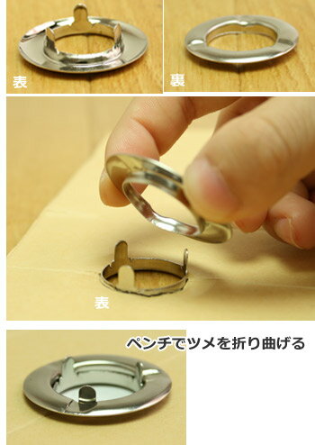 サイズ: 穴径約21mmx外径35mm素材: 金属*ペンチでツメを折り曲げるだけで簡単に取り付けられるハトメ ひもなどを通すための環状の金具。