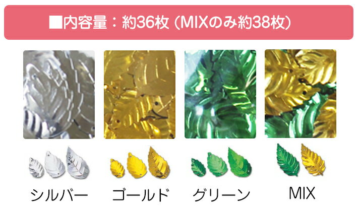 ■素材/ 塩化ビニール(手洗い等の摩擦によって色落ちする場合があります) 小:縦約1.5cm 横約0.9cm 中:縦約1.9cm 横約1.1~1.2cm 大:縦約2.4cm 横約1.3cm (シルバー、ゴールド、グリーン共通) ミックスのサイズ:縦約2.5cm 横約1cm ※リーフの巾が広い部分を計測しています。