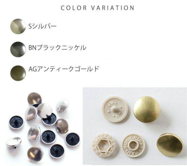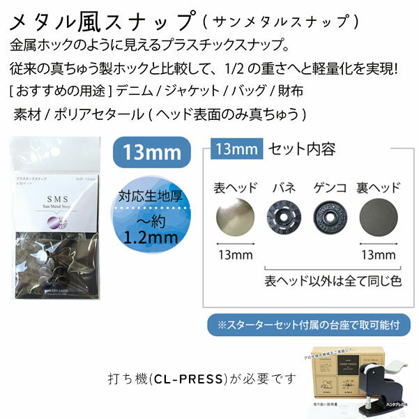※プラスナップ専用打ち機(CL-PRESS)が必要です SUN METAL SNAP(SMS) 金属ホックに見えるプラスチックホック。 表面に本物の金属を巻いた、高級感と樹脂の軽さを兼ね備えたタイプ。 取付可能な素材の厚みの目安 : 【10mm】 〜 1.0mm / 【13mm】 〜 1.2mm 取付素材を圧縮した状態で、アタマの足(先端)が2.5mm 出ていればOKです! プラスチックホックに金属を被せた金属ホック風プラホック。 従来の真鍮製ホックと比較して約1/2の軽量化を実現。 金属キャップに施したメッキは、すべてニッケルフリー及び真鍮素材を使用した仕上げです。 検針性能もNC-A基準をクリアーしております。 「 Oeko-Tex Standard 100 」 規格の認証を得た安全品質スナップです。(世界的有害物質検査機関)