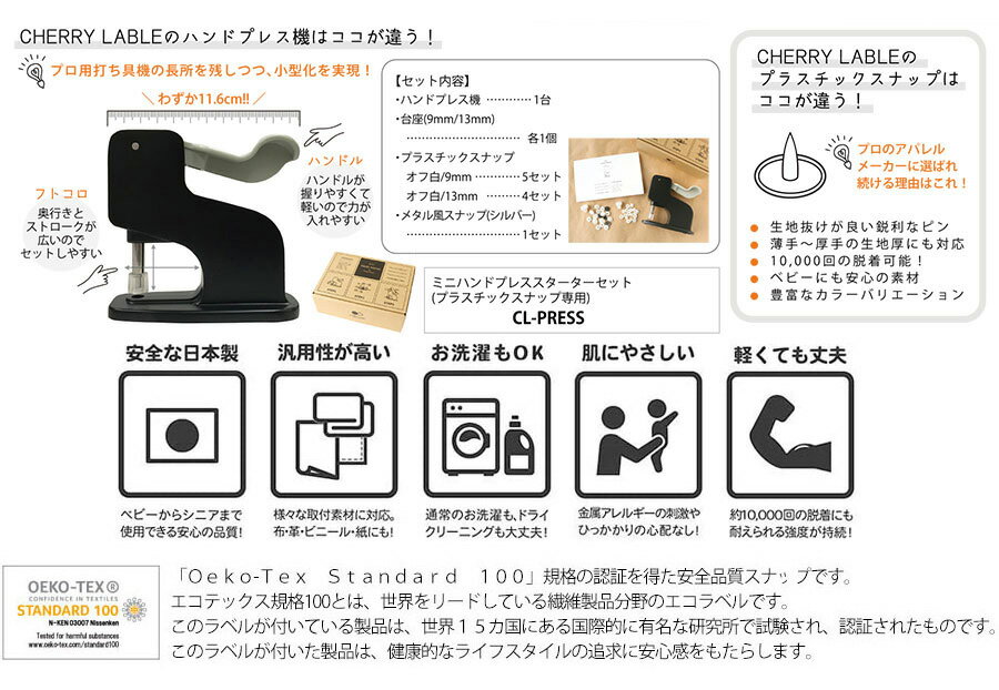 チェリーラベルシリーズのプラスチックスナップ専用打ち機(CL-PRES)に、プラスチックスナップ30色ケース付セットと、金属風スナップ ボタン 10、13、15mmケース付セットのフルセット。 ●生地に食い込む構造の、強いホック「SUN GRIP」シリーズの全30色、ケース付 スポーツやアウトドアなど、強度が必要なシーンでも使用できます。 足部分が長いので、厚めの生地にも使いやすい。 ●SUN METAL SNAP(SMS) 金属ホックに見えるプラスチックホックの、全サイズ、全カラーが揃ったケース付セット。 プラスチックホックに金属を被せた金属ホック風プラホック。 従来の真鍮製ホックと比較して約1/2の軽量化を実現。 金属キャップに施したメッキは、すべてニッケルフリー及び真鍮素材を使用した仕上げです。 検針性能もNC-A基準をクリアーしております。 「 Oeko-Tex Standard 100 」 規格の認証を得た安全品質スナップです。(世界的有害物質検査機関)