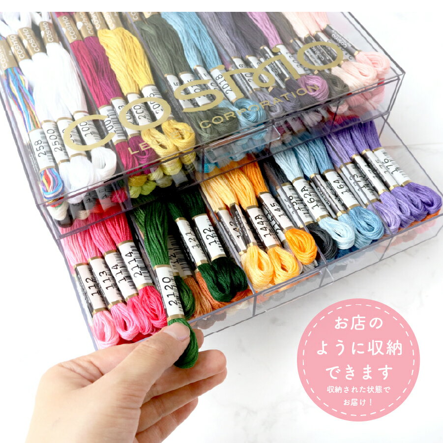 コスモ 25番刺しゅう糸が全色揃う什器付きスペシャルセット。 色番号シール、コスモ刺しゅう糸実物見本帳付き! ■セット内容 ■什器2台 1台…22×14.5×17cm ■刺しゅう糸#25 全501色セット(各1本) ■コスモ刺繍糸 実物見本帳 素材:綿100% 自分なりの色使いを見つけるためのきっかけにどうぞ! 刺しゅうやステッチ、パッチワークの縁かがり等幅広く使用でき、 カラーが豊富でお好みに合わせて楽しむことが出来ます。 六本のより糸から出来ています 多くの刺しゅう愛好家に愛されています。 高級エジプト綿(なめらかな光沢、退色しにくい)を使用し、豊富な色数が魅力です。 細かいステッチから太いステッチまで対応できるので、最も幅広く使われている刺繍糸です。
