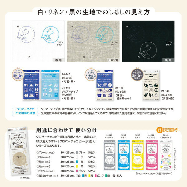 繊細なラインがしっかり写る「クロバー チャコピー」刺しゅう用◇白と紫の特徴◇1.図案がはっきり写り、刺しゅう作業中の摩擦に強い付きのよいインクです。(完全には消えにくいインクです)2.刺しゅうの図案に適した新色「紫」カラーのチャコピー3.刺しゅう用シリーズは白と紫の2色展開でほとんどの色の生地に対応します。◇青(クリアータイプ)の特徴◇1.筆圧の弱い方でも鮮明にはっきり写る2.霧吹きなどの少量の水で簡単にしるしが消せる■サイズ/30×25cm■入数/CL24-146: 白5枚入CL24-147: 紫5枚入CL24-148: 白3枚入、青2枚入CL24-149: 青5枚入※青(クリアータイプ)は紫と比較してデリケートなインクです。図案が鮮やかに写ったり水で簡単に消えるので便利ですが、光や空気中の水分の影響でインクが退色してくるので、保管にお気をつけください。