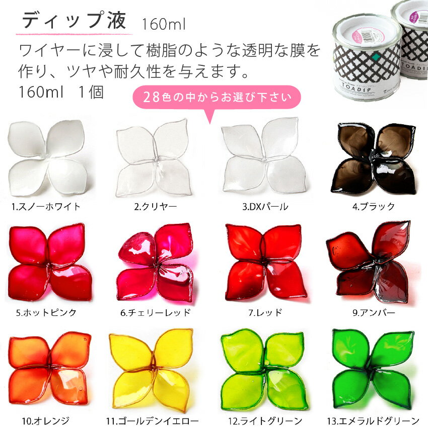 ■セット内容 【お好きな色をお選びください】ディップ液1個 地巻ワイヤー(#18) カラーワイヤー(#24、#28) ゲージパイプ レシピ アメリカンフラワーとは…ワイヤーで作った花びらをディップ液に浸し、花芯、地巻ワイヤーと花びらをフローラテープで束ねます。 初心者の方にもおすすめ! 必要な材料とディップ液1個のカラーが選べるお得なセットです。 ディップ液 クリア マニュキュア フラワー レジン アメリカンフラワー トアディップ ネイルアート 透明 絵具 トアディップ ディップアート ディップフラワー ディップ液 フラワー ワイヤーフラワー ワイヤーアート 花▼単品販売はこちら ディップ液ゲージパイプフローラテープ