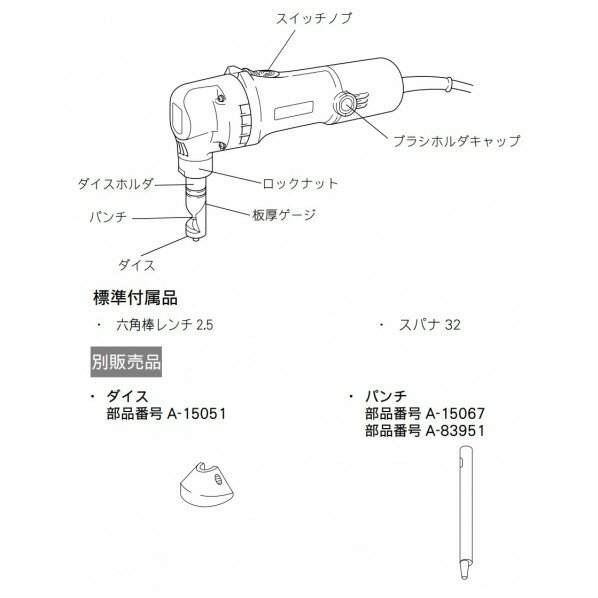 特徴 ●切断能力(mm):軟鋼板:1.6、ステンレス板:1.2、アルミニウム板:2.5 ●最小切断半径(mm):内:45、外:50 ●ストローク数(min-1):2200 ●電源(V):単相100 ●電流(A):5.8 ●消費電力(W):550 ●コード(m):2 ●質量(kg):1.6 ●標準付属品:ダイス・パンチ・六角棒レンチ5・スパナ32 ●軟鋼板、ステンレス板などの切断に! ●斜め切断、施工後の折板の重ね切りもOK! ●二重絶縁 ●カーボンブラシ呼び番号408 仕様 カラー 青 入数 1個 JN1601