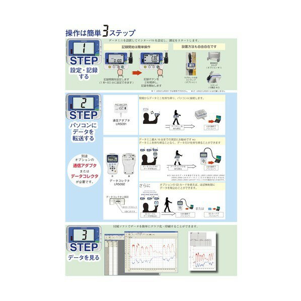 特徴 ■特徴 計装信号4-20mAを測定・記録できるコンパクトロガーです。 設置スペースを気にしない小型軽量ポケットサイズです。 一目で分かりやすい2項目表示です。 大容量の内部メモリ(1chあたり60,000データ)搭載です。 記録を停止しないでPCにデータ転送可能です。 記録しながら電池交換ができます(電池を外しても約30秒間は記録を継続)。 一つ前の記録データをバックアップするので、万が一の誤操作でも安心です。 ■用途 計装信号4-20mAの測定に。 ■仕様 最大表示:5000カウント 保護等級:IP54 測定項目:直流電流 1ch 記録方法:ワンタイム記録(メモリフルで記録停止)、エンドレス記録(メモリフルで古いデータへ上書き) 録モード:瞬時値記録(記録間隔ごとに瞬時値を記録)、統計記録(1秒間隔で測定し、記録間隔ごとの瞬時値/最大/最小/平均値を記録) 記録間隔:1/2/5/10/12/20/30秒、1/2/5/10/15/20/30/60分 記録容量:瞬時記録(60,000データ/1ch)、統計記録(15,000データ/1ch) 表示内容:測定値、記録間隔、日付、時間、アラーム、電池残量、記録データ数、最大値、最小値 機能:データバックアップ(1回前の記録データをバックアップ) ■付属品 接続ケーブル(LR9801)×1 単3形アルカリ乾電池(LR06)(本体内蔵)×1 取扱説明書×1、操作ガイド×1 スタンド×1 ■注意点 LR5000sデータミニで記録したデータの収集、パソコンへの転送にはLR5091もしくはLR5092のいずれかが必要です。 検相器 検相器 電気測定 電気計器 仕様 サイズ 79×28×57mm 入数 1点 1345203