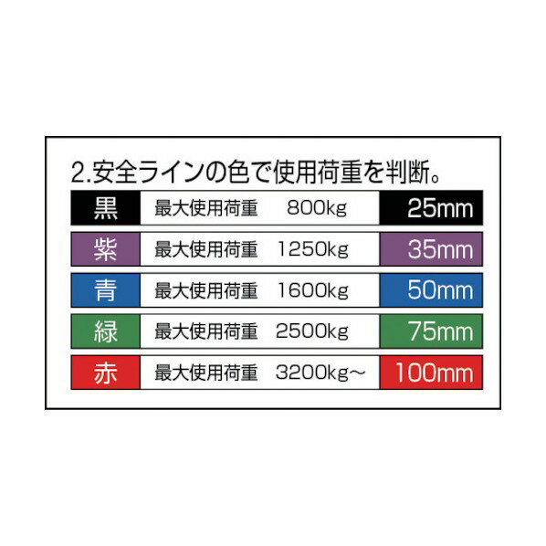商品画像はイメージ画像です。実際とは異なる場合がございます。 特徴 ■特徴 軽くて、曲がりやすく、扱いやすいので、玉掛け作業の能率が向上します。 強力ポリエステル糸を使用しており、引張強度、耐久性、耐摩耗性、低伸度など優れた特長があります。 アイ部と安全ラインの色分けにより、長さ・幅をわかりやすくしました。 ■用途 一般屋内外での玉掛け作業。 ■仕様 両端アイ形 ■注意点 繊維製品ですので寸法に多少の誤差があります。2本組などで厳密な長さ揃えが必要な場合には事前にご相談ください。 荷物の鋭利な角や摩擦によってベルトスリングなどの繊維スリングを傷つける恐れがある箇所には、必ずコーナーパッドなどの当て物を使用してください。 当て物を使用していても荷物の横滑りや周囲の壁や物への接触、加圧などによりスリングが損傷および切断する可能性がありますので作業環境には十分に注意してご使用ください。 仕様 サイズ 25mm×1.5m 入数 1本 PE0250150