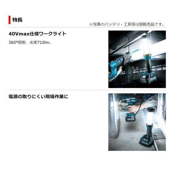 特徴 40Vmax充電式ワークライト 高輝度LED360°照射、先端ライト、USB機器充電可能 本体のみ/バッテリ・充電器別売 40Vmax メインLED :0灯 サブLED:1灯 照度340lx (光束710lm) (メインLED20灯使用時) ルクスは光源より先方0.5m 本機寸法:長さ126×幅86×高さ376mm[メタルフック収納時](BL4025取付時) 質量(バッテリ除く):0.46kg コードレス 仕様 カラー 青 入数 1点 ML002G