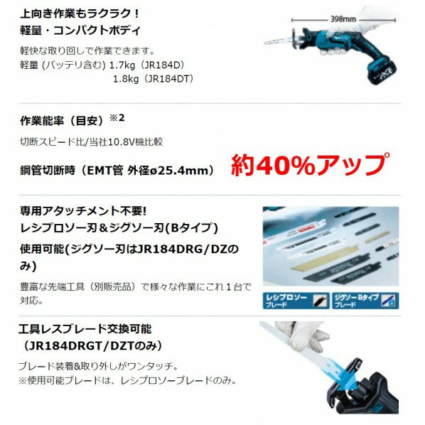 特徴 工具レスタイプ(DRGT)登場。 マルチポジションスイッチで抜群の取り回し+優れた作業能率で快適切断 バッテリBL1860B・充電器DC18RF・プラスチックケース付 [実用充電 約27分/フル充電 約40分 18V リチウムイオン6.0Ah レシプロソー刃使用可能 ジグソー刃(Bタイプ)は使用不可 工具レスブレード交換 最大切断能力:パイプ?50mm(152mmブレード使用時) 最大切断能力:木材50mm(152mmブレード使用時) コードレス 仕様 入数 1セット JR184DRGT
