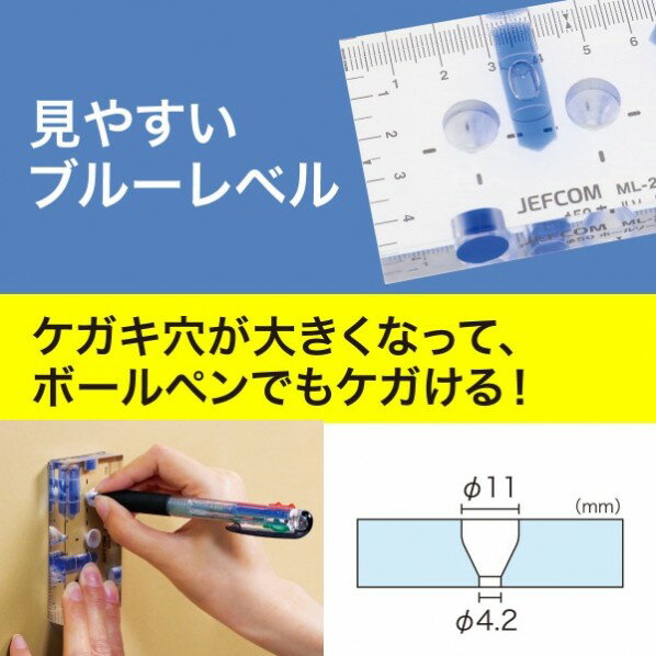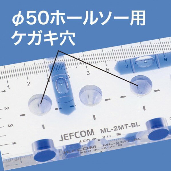特徴 ブルーレベルで見やすくなった(φ50ホールソー用) ●スイッチボックスのケガキが楽にできる ●φ50mmのホールソー用ケガキ穴付 ●磁石3個付 ●目盛り付 ●ケガキ穴が大きくなって、ボールペンでもケガけます ●垂直・水平 ・本体サイズ・質量:51mm×13mm×95mm・74g ・材質 PMMA(アクリル樹脂) ・梱包仕様 個装梱包:ブリスター・台紙 個装サイズ・質量:W86×D18×H197mm・94g ・1個口 ・原産国:中国 仕様 重量 94g 入数 1個 ML2MTBL