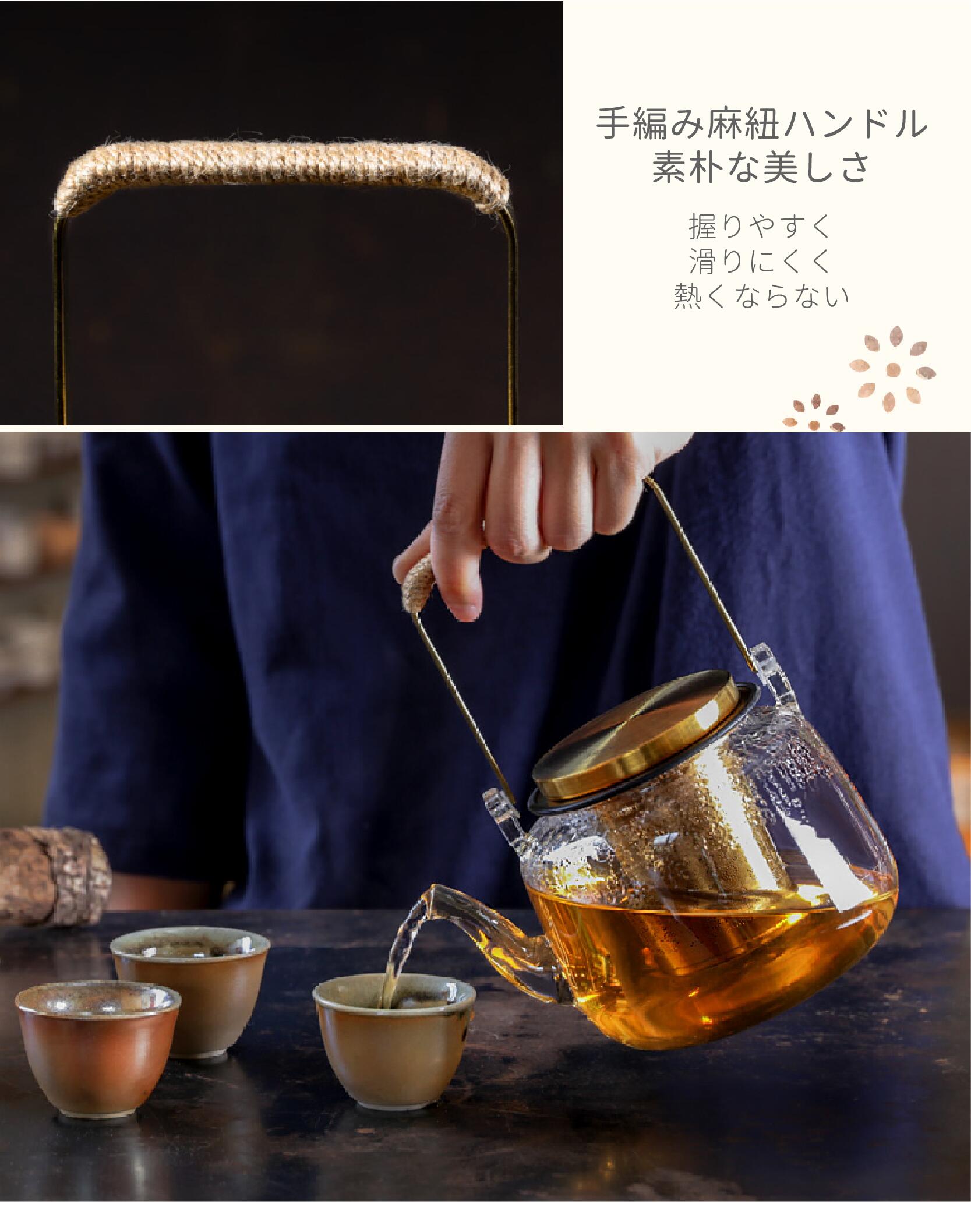 輝きガラス ハンドルティーポット 700ml 3色 耐熱ガラス 洗いやすい 手編み麻紐 大容量 握りやすい 滑りにくい 精密フィルター 強化 直火加熱可 アライン加工 150度に耐える【宜龍】【台湾直送】【送料無料】