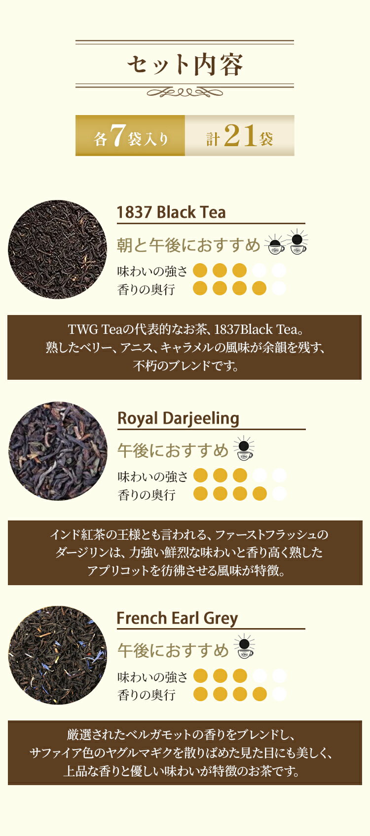 お茶のご紹介 【Epicure Teabag Selection】―日本限定商品― 「エピキュアティーバッグセレクション」のみの、日本でしか手に入らない特別な組み合わせのティーバッグアソートです。 エピキュアは"美食家"を意味し、爽やかなグリーンのスリーブに包まれています。TWG Teaらしいオリジナルブレンドと、定番の紅茶ブレンドが同時に楽しめるアソートで、贈りものにもぴったりです。 ■1837 Black Tea(紅茶) TWG Tea の代表的なお茶として知られる1837 Black Teaは、熟したベリーやアニス、キャラメルなどの風味が余韻に残る、時を越えた不朽のブレンドです。 ■Royal Darjeeling(紅茶) インド紅茶の王様とも言われるダージリン の、ファーストフラッシュ(春摘み)の茶葉の TWG Teaオリジナルブレンドです。 力強い味わいと、熟したアプリコットを彷彿させる風味が特徴です。 ■French Earl Grey(紅茶) TWG Teaのお茶の中でも特に人気のアールグレイ。厳選されたベルガモットの香りをブレンドし、サファイア色のヤグルマギクを散りばめた見た目にも美しく、上品な香りと優しい味わいが特徴のお茶です。 【自分へのご褒美、大切な人への贈り物に】 誕生日ギフト 母の日 ギフト 父の日 プレゼント バースデー 結婚祝い 内祝い お祝い返し ギフトセット おしゃれな贈り物 紅茶 ギフト 紅茶 プレゼント 高級 紅茶 人気 紅茶 紅茶ギフト 詰め合わせ ティーバッグ ギフト 個包装 小分けで配りやすい 高級感 贈答用 【こんな方にも】 女性 男性 友達 友人 女友達 カップル 夫婦 彼氏 彼女 同僚 先輩 後輩 先生 上司 部下 お母さん お父さん 義母 義父 おばあちゃん おじいちゃん 10代 20代 30代 40代 50代 60代 70代 80代 【季節のご挨拶やイベントにぴったり】 お歳暮 お中元 敬老の日 クリスマス バレンタイン ホワイトデー ハロウィン 年末年始 お年賀 冬ギフト お中元 夏ギフト 夏の贈り物 クリスマスプレゼント お返し 暑中見舞い 残暑見舞い 挨拶回り 引っ越し挨拶用 退職祝い 紅茶 ギフト 紅茶 詰め合わせ ギフト 帰省土産 手土産 入学祝い 卒業祝い 成人祝い 出産祝い 新築祝い 【ほっと一息つきたい時に】 ティータイム おうちカフェ リラックス時間 在宅勤務 ご褒美タイム 夜のリラックスタイム 休日の朝にぴったり ブレイクタイム リラックスタイム おうち時間 おしゃれ 紅茶 紅茶 ギフト アフタヌーンティー 【法人様向けのご挨拶にもおすすめ】 ビジネスギフト 取引先への贈り物 法人向け プレゼント 会社用 法人用お歳暮 企業向けギフトセット 忘年会 個包装 上司 【TWG Teaの豊富な紅茶ラインナップ】 TWG 紅茶 ブラックティー カモミールティー アールグレイティー イングリッシュブレックファストティー 緑茶 ルイボスティー ジャスミンティー オリジナルブレンドティー