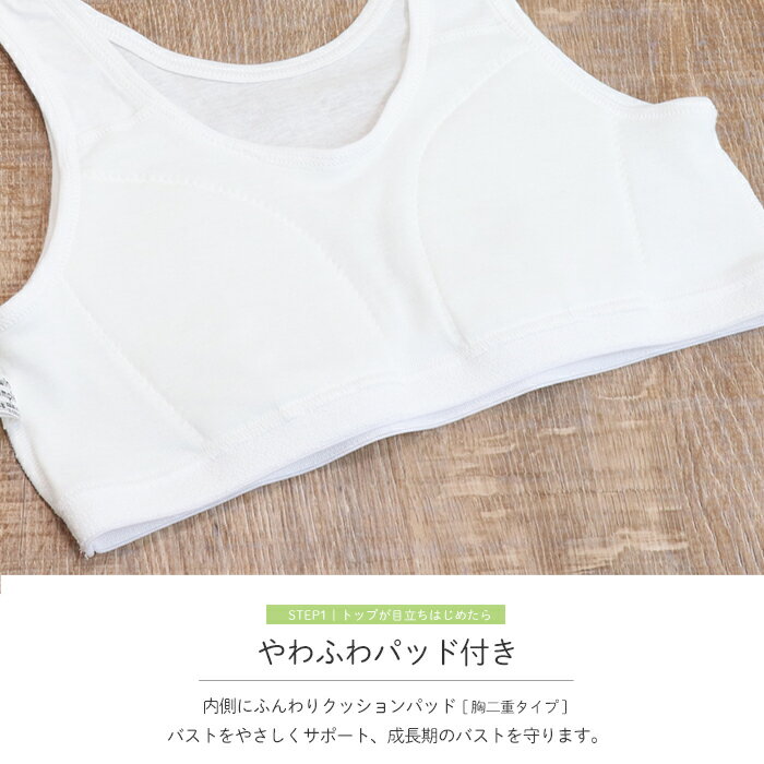 おすすめカテゴリー 【掲載商品の在庫について】 掲載商品につきましては、実店舗と共有しているため 「在庫有り」の表示があっても、ご注文後に欠品が 発生する場合がございます。完売や欠品の場合は 誠にご迷惑をお掛け致します。予めご了承くださいませ。キャミハーフタイプはこちら 商品情報 【STEP1】ジュニア向けハーフトップ 「まだ本格的なブラジャーは恥ずかしい…」 そんな成長期のお子さまにおすすめ! ステップアップにもぴったりなハーフブラジャー ・ 綿100%で肌にやさしい着心地 ・三層構造で透けをしっかりガード ・厚みのあるクッションパッドで胸をやさしく守る ・学校や部活にも使いやすいシンプルデザイン 初めてのジュニアブラとしても安心の日本製品質。 小学生から中学生まで幅広くご利用いただけます。 Q. 小学校高学年でもサイズは合いますか? A. 140~165cmまで対応し、成長期に合わせてフィットします。 Q. 洗濯で縮みませんか? A. 綿100%は天然繊維のため、多少の縮みが発生する場合があります。 ただし、縫製や生地の厚みを工夫しているため、大きく形が崩れることなく 安心して毎日ご使用いただけます。 Q. 体育や部活で使えますか? A. 吸汗性の高いコットン素材とシンプルデザインで、スクールインナーやスポーツ時にも最適です。 商品名 【日本製】やわふわハーフトップ サイズ 140/150/160/165cm カラー 白 生地 40フライス 組成 綿100%ゴム部分:ポリエステル50%/綿40%/ポリウレタン10% 日本製 日本企画・デザイン|この商品はツインディンプルが企画・製造した商品です。 キーワード ホワイト 白地 シンプル 綿100% コットン 日本製 国産 丈夫な縫製 スクールインナー 制服インナー 下着 肌にやさしい 敏感肌対応 かゆくなりにくい 通気性 吸汗速乾 透け防止 胸二重構造 ソフトパッド付き スポブラ ハーフトップ ブラジャー ハーフブラ 子供 女の子 女児 ガールズ ジュニア 小学生 小学生高学年 中学生 中学生女子 成長期インナー ステップアップ ジュニア期専用 はじめてブラ STEP1 140 150 160 165 体育 部活 運動会 修学旅行 発表会 学校行事 デイリー使い 入学準備 春 夏 秋 冬 オールシーズン 洗い替え用 まとめ買い 災害備蓄 プレゼント ギフト おすすめカテゴリー