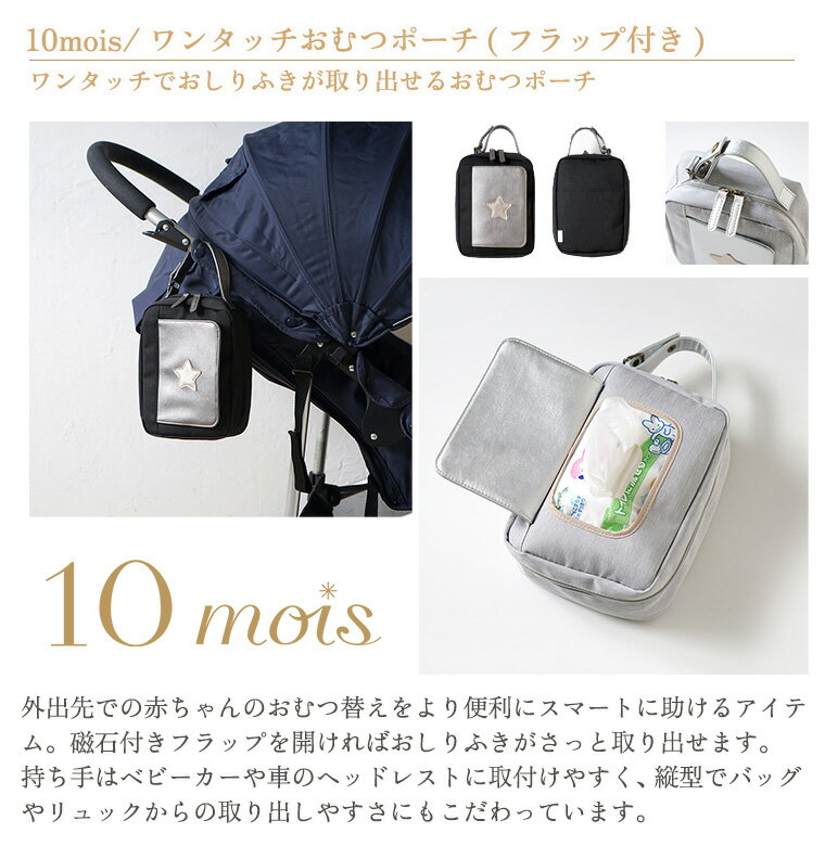 【特徴】ポーチを開けなくても、フラップからワンタッチでおしりふきが取り出せるおむつポーチ。 外出先での赤ちゃんのおむつ替えをより便利にスマートに助けるアイテム。 磁石付きフラップを開ければおしりふきがさっと取り出せます。 持ち手はベビーカーや車のヘッドレストに取付けやすく、縦型でバッグやリュックからの取り出しやすさにもこだわっています。 ベビーサイズおむつ約5枚とおしりふきが余裕を持って入ります。 外側にもポケットがあり、ビニール袋などの小物の収納もできます。 【サイズ】(本体)約20×15×マチ7.5cm (おしりふき取り出し口)約12×8cm 【素材】(外側)ポリエステル100%(表面:撥水加工) (合皮部分)ポリウレタン100% (内側)ポリエステル100% 10mois ディモワ ディモア ワンタッチおむつポーチ(フラップ付き)星 スター ポーチ ママ用品 お出かけ ベビー 出産祝い おむつ トイレ用品