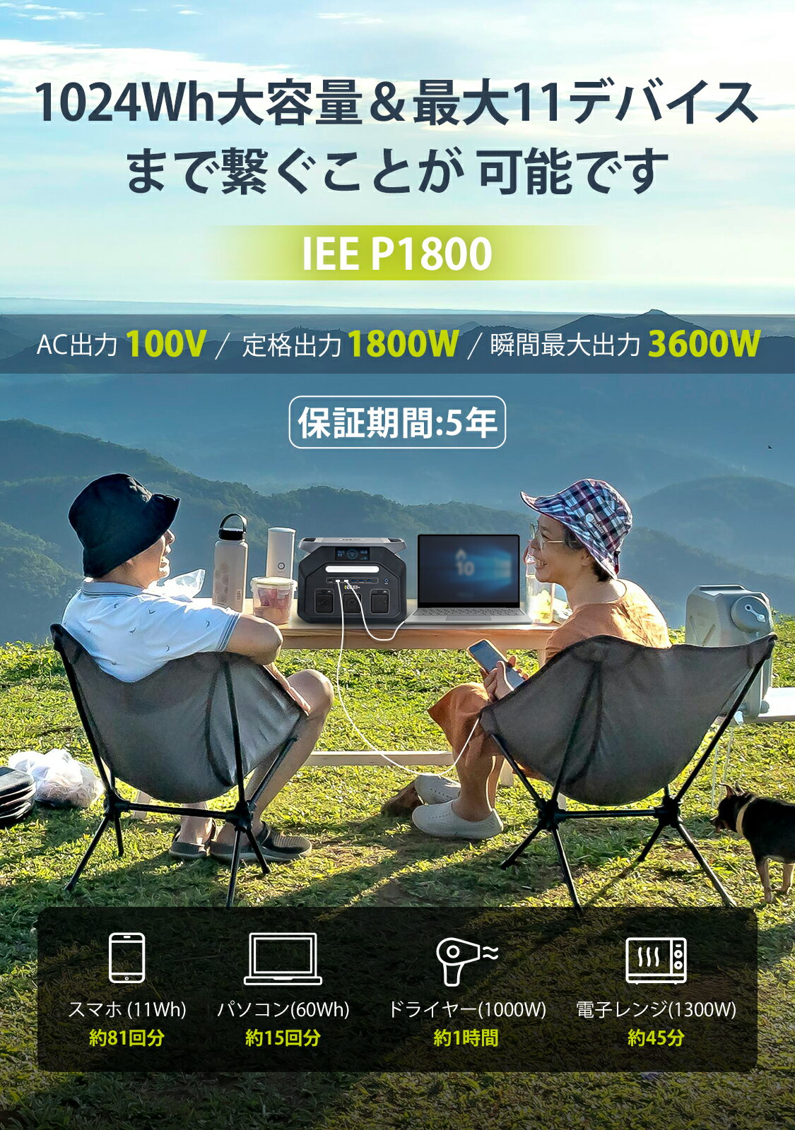 商品情報商品説明大容量&高出力】IEE P1800 ポータブル電源は1024Whの大容量バッテリーと1800Wの高出力を実現します。家庭用電源として十分な電力供給できて、ドライヤー(1000W) 電子レンジ(1300W)など、一般的な家電を同時に駆動可能です。100V純正弦波出力、日本の家電に最適化です。【急速充電対応】AC充電なら0→80%が約1時間、フル充電でも約1.2時間です。キャンプや車中泊でも、晴天時、500Wソーラーパネルで約1時間でフル充電可能です。【長寿命LFP(LiFePO4)バッテリー】4000回の充放電後でも70%以上の容量を維持して、1日1回充電しても、約10年間使用可能です。【超静音運転】25dBの超低騒音で、ほぼ無音に近いです。マンションや病院使用に最適です。【災害時の長期備蓄用として最適】災害と停電の場合は、スマホ充電×81回 + LED照明×90時間連続稼働が可能で、CPAP(睡眠時無呼吸症候群用機器)や酸素濃縮器も給電できます。本体側のケースの中に、4-in-1スマホの充電ケーブルとLEDライトも同梱されています。収納時はハンドルを畳むことで、狭いスペース(クローゼット、キッチン隅)にも収納可能です。商品特徴【1024Whの大容量、連続出力1800Wポータブル電源】軽量設計のIEETekポータブル電源。純正弦波、MPPT制御、連続出力1800W、瞬間最大3600W、高効率で安全なリン酸鉄リチウム電池を搭載。最大8台の機器を同時に駆動可能。キャンプ、車中泊、災害時、停電対策に最適なマルチシーン対応電源です。【🔋超高速充電システム】 70分フル充電(AC充電/業界最速クラス)多様急速充電方式マトリクス:AC(1.1時)・ソーラー(2時)・車載(9時)【長寿命セーフティ設計(LiFePO4リン酸鉄リチウム電池搭載)】4,000回充放電サイクル※ 1日1回使用で10年間稼動可能 → サイクル後も80%容量維持【6重保護機構】過充電/過放電/過負荷/短絡/過電圧/過熱【?停電時も安心のUPS機能】10msの高速切り替えUPS機能を搭載し、停電時も電力が途切れず、PCやネットワーク機器の安全を確保。パススルー機能により、本体を充電しながら同時に外部デバイスへ給電可能。【安心の長期保証】IEETek P1800は、基本保証3年+延長保証2年の合計5年間の長期保証付き。公式サイトでご購入いただくと、自動的に5年保証が適用されます。【スマートアプリ連携📱】Wi-Fi/Bluetooth機能搭載|スマホアプリで遠隔監視&ソフト更新をリアルタイム対応【アウトドア向け照明機能】常時充電可能なLED懐中電灯と4-in-1充電ケーブルを標準装備。キャンプや災害時など、暗所でのデバイス充電と照明を同時にサポートアウトドア向けアウトドア向け照明機能】常時充電可能なLED懐中電灯と4-in-1充電ケーブルを標準装備。キャンプや災害時など、暗所でのデバイス充電と照明を同時にサポート保証についてIEETek P1800は、基本保証3年+更にIEETek公式サイト(jp.ieetek.com)にてオンライン会員登録すると延長保証2年の合計5年間の長期保証付きますので安心して長期間使用できます。製品の信頼性とサポートがしっかりと提供されます。さらに、日本人現地スタッフによる安定した製品供給と充実したアフターサービスを提供してまいります。公式認証についてPSE、技適取得済み。発送について安全安心のヤマト運輸、佐川急便にて発送致します。\新商品登場記念イベント!クーポンで10% OFF+ポイント5倍/ IEEtek ポータブル電源 P1800, 1024Wh大容量, 定格1800W/瞬間最大3600W, リン酸鉄バッテリー 長寿命10年 70分で急速フル充電 小型軽量コンパクト UPSパススルー機能 家庭用蓄電池 APP操作 ソーラーパネル対応 \新商品登場記念イベント!クーポンで10% OFF+ポイント5倍/ IEEtek ポータブル電源 P1800, 1024Wh大容量, 定格1800W/瞬間最大3600W, アウトドアでも、災害時でも、頼れる1台。 5