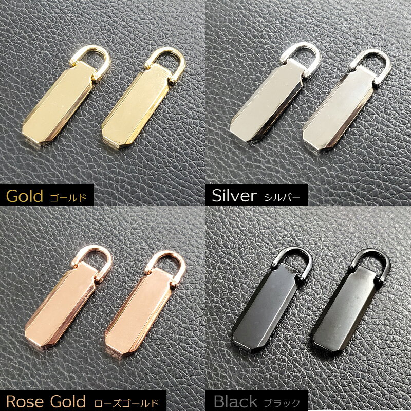 2個セット ファスナー引き手 角型の説明 亜鉛合金のファスナー引き手 2個セット商品です。 引き手部分に穴なしタイプです。2個とも同じ色になります。 亜鉛合金は、耐食性・耐久性に優れており、酸化・腐食に強く、壊れにくいです。 引き手は親指の第一関節程度の大きさで、つかみやすいです。 U字型ループ金具と引き手の2つの部品をつなげるため、 約270度回転して使い勝手が良い作りとなっています。 【取付方法】 1 U字型ループ金具を外します。 溝の部分に、マイナスドライバーの先端を入れて、ドライバーを回転させて外すことができます。 爪で外れる場合もありますが、結構硬いループのため、マイナスドライバーの使用をお勧めします。 2 取り付けたい財布・バッグなどのスライダーのリングに、U字型ループ金具を通します。 3 U字型ループ金具に、引き手を取り付け後、U字型ループ金具の両端を指で強く押して閉じます。 4 完成 2個セット ファスナー引き手 角型の詳細 素材: 亜鉛合金 色:ブラック シルバー ゴールド ローズゴールド サイズ:5号 寸法: 全長41mm 引き手厚さ 3mm 引き手長さ 32mm 引き手最大幅 12mm(先端部分) U字型ループ外寸 縦12mm×横13mm U字型ループ内寸 縦10mm×横9mm