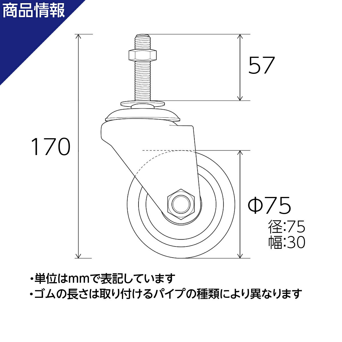 キャスター タイヤ径 75mm タイヤ幅 32mm 車輪 コマ 差し込み式 (NTYパイプ ブラックに適合 取付け用レンチ付属)