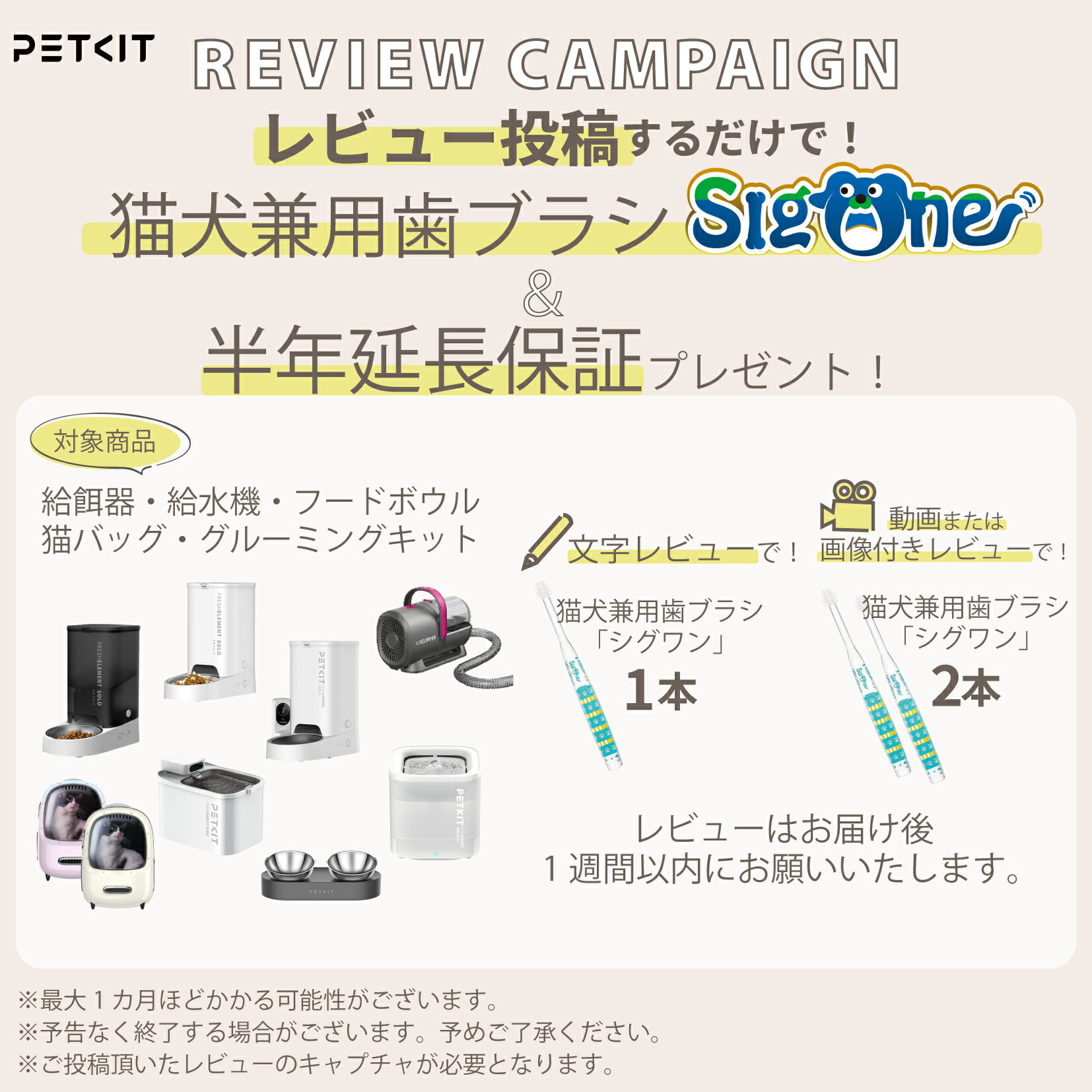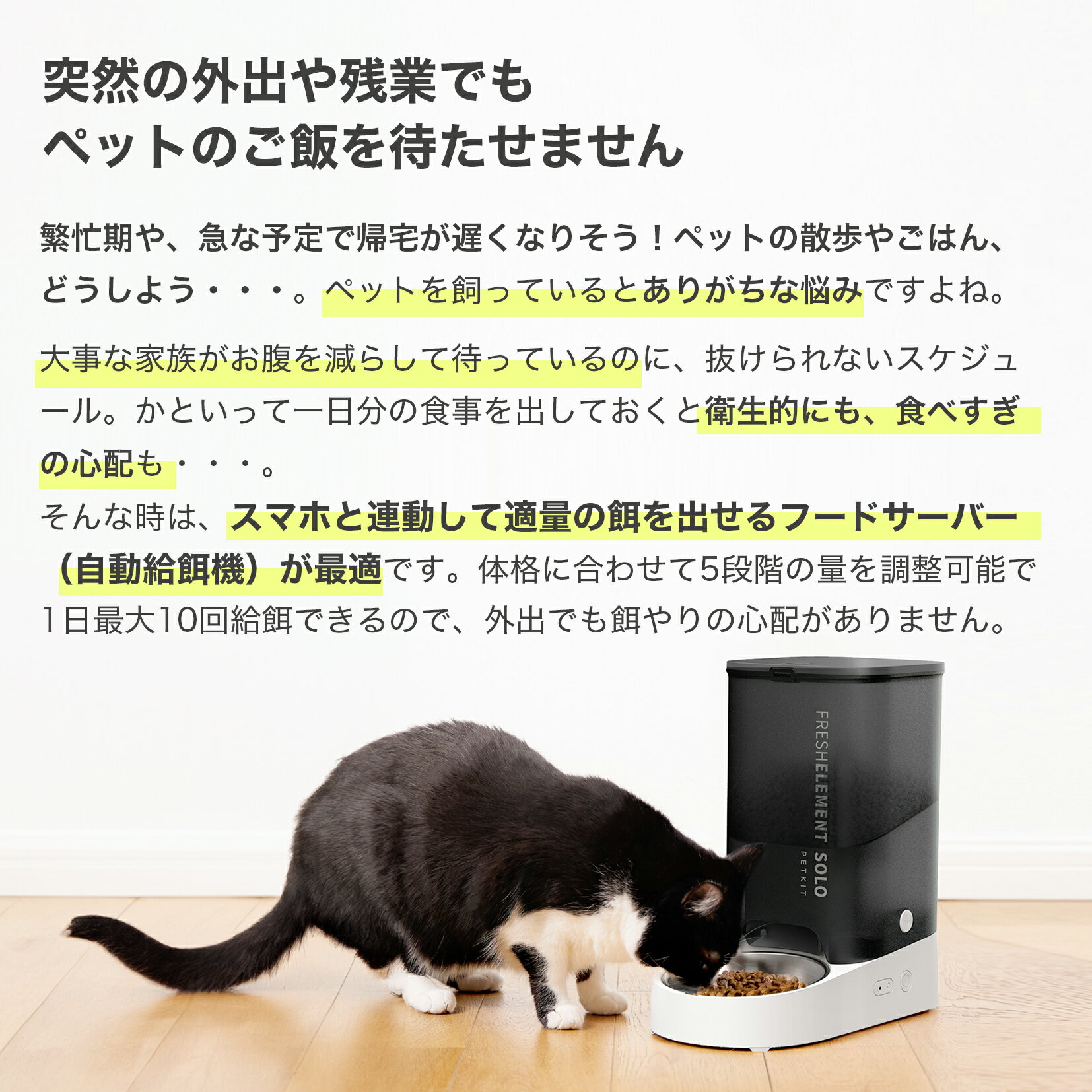 よく一緒に購入されている商品\BLACK FRIDAY 20%OFFクーポ5,190円 選べるトイレ用 純正ごみ袋 タイプA タイ1,750円~\BLACK FRIDAY 20%OFFクーポ53,890円~ PRODUCT BRAND : PETKIT (ペットキット) MODEL : Fresh Element SOLO Smart Pet REFERENCE : P570 説明書 : 取扱説明書(PDF) BRAND INFORMATION PETKIT Fresh Element SOLO Smart Pet 【給餌量の設定】 10グラム刻みで10g、20g、30g、40g、50gの5段階でフードの量を設定することができます。 食事だけでなく、おやつとして少量上げるのにも最適です。 また給餌の回数も最大10回に設定することができるので、生活リズムに合わせて柔軟に対応可能です。 【ペットフードタイプ】 フリーズドライ、ミックスフード、ドライフード、エアドライフードの種類に対応。 今までの好みのご飯をあげることができます。 【大容量タンク&安心設計】 3Lの大容量タンクは成猫でおよそ15日分のフードをいれておくことができます。 また密閉することができる強化エアパッキンで空気を遮断しフードの酸化を防ぐので、フードの鮮度を保てる安心設計。 供給口は給餌後自動で閉まるので、虫が入る心配もありません。 【スマホでのコントロール】 スマホアプリと連携すれば様々な設定・コントロールが可能となります。 ・エサやりのタイミングの設定 ・追加のエサやり ・エサやりのリマインド ・乾燥剤交換のリマインド ・バッテリー交換のリマインドなどが設定できます。 種別 ペット家電・ペット用給餌器 モデル PETKIT Fresh Element SOLO Smart Pet カラー ホワイト グレー サイズ 16.7cm x 29.6 x 31.6 cm 電源 コンセント式 容量 3.0L 定格電圧・電圧 5VDC 定格出力2W 接続方法 Wi-Fi 材質 ABS 保証年数 1年 パッケージリスト 本体、シリカゲル乾燥材 備考 商品のよくあるご質問はこちら ※当社では、スタジオでストロボを使用して撮影しております。また、お客様のモニターを通してご覧になって頂いている為、実物を蛍光灯や自然光の下でご覧になった場合と色味が異なる場合がありますので、ご理解の上ご購入頂きますようお願い致します。 ※付属品は仕様変更等により、若干異なることがございます。 商品に関するお問い合わせはメーカーへのご連絡をお願いする場合がございます。 類似商品はこちら\BLACK FRIDAY 20%OFFクーポ19,800円\BLACK FRIDAY 20%OFFクーポ21,930円\BLACK FRIDAY 20%OFFクーポ82,100円\BLACK FRIDAY 20%OFFクーポ13,600円\BLACK FRIDAY 20%OFFクーポ5,190円\BLACK FRIDAY 20%OFFクーポ117,400円\BLACK FRIDAY 20%OFFクーポ53,890円 ペット用 フードボウル 給餌皿 PETKIT2,980円\BLACK FRIDAY 20%OFFクーポ53,890円~新着商品はこちら2025/11/26\ブラックフライデー point10倍/ヴェル108,000円2025/11/26\ブラックフライデー point10倍/ヴェル120,000円2025/11/17\ブラックフライデー point10倍/ヴェル95,000円再販商品はこちら2025/11/27\ブラックフライデー point10倍/ハミル47,000円2025/11/27\ブラックフライデー point10倍/サルヴ61,000円2025/11/27\ブラックフライデー point10倍/グッチ67,000円2025/11/27 更新