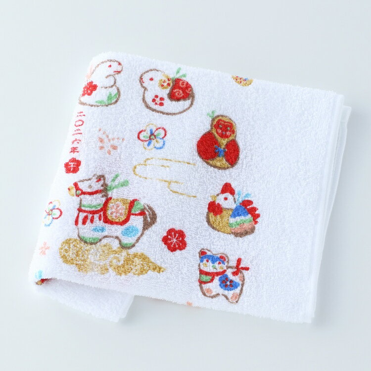 幸いを呼び込む縁起の良い祥雲に乗った馬を中心に、干支の動物たちが輪になった、ほがらかな雰囲気のプリント柄です。 <特徴> 2026年の干支は「うま」。うまモチーフのおめでたいお年賀タオルです。年始のご挨拶におすすめの商品です。 <商品についてのご注意> こちらは包装紙で包装された状態での箱入り商品となります。他の商品との詰め合わせは承っておりません。 また、リボン掛けは承っておりません。あらかじめご了承ください。 熨斗掛けや手提げ袋をご希望の場合は、注文内容の確認ページ内の「ご要望・ご質問等」にて、熨斗掛け・手提げ袋希望の旨をご記載ください。 熨斗の掛け方は「外熨斗」、熨斗種類は「御年賀ー蝶結び」とさせていただきます。ローヤルクレスト エレガントで使い心地の良い贅沢なタオルをバラエティ豊かに揃えました。優しいくつろぎの空間を演出します。 ◆サイズ:箱(縦×横×深さ)約14×20.8×2.5cm◆サイズ:タオル 約34×85cm◆素材:綿100%◆原産国:ベトナム ・濃色の製品は洗濯液を濁らせることがありますので、他の物とは別にお洗いください。また、色移りを防止するため、濡れたまま放置しないでください。・ソフトに織り上げておりますので毛羽落ちします。他の物とは別にお洗いください。また、くず取りネットのご使用をおすすめ致します。・柔軟剤をご使用されますと、パイル糸が抜けやすく、また、毛羽が落ちやすくなりますので、初め数回のお洗濯にはご使用をお避け下さい。・色、柄物に塩素系漂白剤を使用しないで下さい。