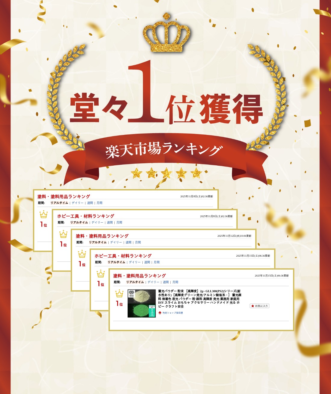通常即納 高品質な蓄光顔料を提供し続けているメーカーとして定評の根本特殊化学株式会社が提供している高輝度蓄光顔料です。「とにかく強く光らせたい!」という場合に候補として筆頭に上がる顔料です。 圧倒的なファーストインパクト 高輝度タイプは一般タイプに比べ消灯した直後に高い発光パフォーマンスを発揮するよう設計されております。 例えていうと、一般タイプが持久走のランナーなら高輝度タイプは短距離走のランナーのような違いです。蓄えた光を初期から強烈に放出します。 低照度環境下でもパフォーマンスを発揮 高輝度タイプの特徴は高いファーストインパクトだけではありません。光を蓄える時の待機環境において、照度が低いような場合でも効率よく光を蓄えパフォーマンスを発揮します。ご使用環境が十分に明るくないような場合は、この高輝度タイプをおすすめいたします。 特記事項 こちらは高輝度グリーンの耐水タイプです。耐水性が必要ない場合(トップコートでクリアできる)などの場合は耐水性のないタイプもご検討ください。 耐水性のないGLL300シリーズ(耐水性なし)と、発光の色相や強度に違いはありません。 FFでは、粘度の高いバインダーなどに使用する際には分散性がやや難しくなってきます。二次凝集を起こしダマが生じる可能性がございます。 【カテゴリー】: 蓄光顔料【無着色】 【ブランド】: N夜光 ルミノーバ / LumiNova 【メーカー】: 根本特殊化学(株) 【明るいときの色】: ペールグリーン 【発光カラー】: グリーン系 ▸ 蓄光パウダー【無着色】をみる ▸ 蓄光パウダー【ブルー発光ベース】をみる ▸ 蓄光パウダー【オレンジ発光ベース】をみる ▸ 蓄光パウダー【グリーン発光ベース】をみる ▸ 蓄光パウダー【その他特色】をみる [ ネックレス ピアス ブレスレット ミニチュア スライム キャンドル DIYインテリア 壁アート 壁掛け時計 ランプシェード ガーデン雑貨 鉢植え ストーン アートパネル 釣り道具 ルアー 浮き スマホケース Tシャツ 布製品 靴 スニーカー カバン リュック 帽子 キャップ クッション 枕カバー トートバッグ ]