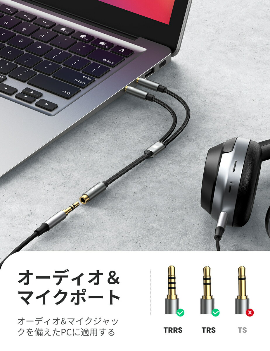 商品情報ブランド:UGREENコネクタ:AUX長さ:20 cm重量:18.14 g対応機種:Turtle Beach XO1/PX24/Recon 50X/XO 7, Sennheiser HD 598 Cs, Logitech UE 6000, Astro A10, Razer Kraken, Razer Man O' War wired headset, Hyperx cloud 2 and more商品説明:UGREEN 3.5mmステレオイヤホンマイク 変換ケーブルを使用すると、ステレオヘッドセットをPCイヤホンジャックとマイクジャックに同時に簡単に接続できます。・サビや酸化に強く、高耐久に優れた金メッキコネクタを採用。・信号の劣化を抑えることができるので、長くお使いいただけます。・ケーブル部に布を編み込んだメッシュケーブルを採用。・ケーブル同士が絡みにくく、耐久性に優れた丈夫なケーブルです。この商品について:【幅広い互換性】スマホやタブレットに付いている 4極のプラグをマイク(3極ジャック)とイヤホン(3極ジャック)に分岐させて、3.5mmステレオミニジャック(マイク入力・ヘッドホン出力)を持つパソコンに接続できるイヤホンマイク変換ケーブルです。【パソコン専用】このオーディオ分配ケーブルは二つのオス端子(イヤホン端子とマイク端子)が搭載しており、ステレオヘッドセットをPCのイヤホンジャックとマイクジャックに同時に簡単に接続できます。VOIPアプリケーションで(例え、Skype, MSN Mesenger, Yahoo, Google Voice等)に対応しています。【Hi-Fi高音質再生】24K金メッキ端子を採用してサビや酸化に強いです。内蔵された銅導体の内装芯線は、信号損失を最小限に減少することができます。高耐久性のナイロン編みと高精度合金の金属外殻で、信号劣化を抑え、手触りが良い、長くお使いいただけます。【持ち運びやすい】小型&軽量な設計で、20cmの長さで取り回しや収納も便利になり、ノートパソコン用バッグの中でも場所を取らず、携帯性が必要な用途にとっては最適なソリューションとなっています。【ご注意】CTIA標準のAndroidヘッドフォンのみに対応しており、CTIA標準のイヤホンに対応不可です。*この変換コネクタは、Apple純正イヤホンとBeatsヘッドフォンをサポートしていません。商品仕様:入力:ヘッドセットまたはイヤホン用3.5mm 4極メス(TRRS)出力1:PC /ラップトップのオーディオジャック用3.5mm 3極(TRS)オス出力2:PC /ラップトップのマイクジャック用3.5mm 3ポジション(TRS)オスケーブル長さ:20cmUGREEN 3.5mm 4極 3極 変換ケーブル 4極(メス) -3極(オス*2)マイク 変換ケーブル 3.5mm 変換ケーブル ステレオ Hi-Fi音質再生 多重シールド 高耐久性ナイロン編み 24K金メッキコネクタ マイク入力・ヘッドホン出力 プラグStep-Down設計 20CM 3.5mm オーディオ変換ケーブル ステレオミニプラグ イヤホン ヘッドホン マイク 分配ケーブル オーディオ分配ケーブル 20CM 2