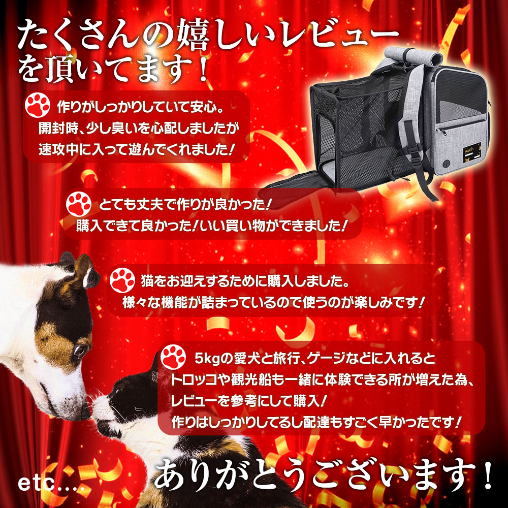 商品の保証期間について(重要) 通常の保証期間は到着後から30日間となりますが、1年間保証など別途設定されている商品もあります。製品仕様に記載がありますのでご確認ください。また商品のサポートや保証方法について記載しております「ご注文前の注意事項、当社商品のサポートについて」をご注文前に必ずご確認いただきます様お願い申し上げます。ペットのおでかけや定期健診にぴったり ペット連れの旅行や登山、帰郷、通院、ドライブ、お散歩などのお出かけに常にお役に立つペットキャリーリュック。ペットにとって、とても快適に移動できます。電車や車での旅行や、獣医への定期健診にもおススメです。 お出かけ便利なリュック型キャリーバッグ 調節可能なショルダーストラップのリュックに手提げ用ハンドルがついており、そのままシートベルトに固定していただいたらドライブ用にもなる、3way使えるリュック型キャリーバッグです。長時間背負っても疲れません。 拡張できる&通気性抜群で蒸れないメッシュ窓 上部と背面と真正面の3つの出入り口があり、ペットの出入りが便利です。さらに三面にメッシュが採用され、通気性良いです。上部のメッシュ扉で中の様子が見れます。お出かけ中ペットの様子が歩いていても見れる安心なキャリーです。 夏用・冬用のマット付き 便利な中敷きマットが付属しています。暑い夏は茣蓙仕様で、寒い冬はフワフワの布仕様で使い分けることができます。 折りたためるので、収納しやすい 使わない時は、畳めるので場所をとらずとても便利な犬猫用ペットキャリーリュック。 飛び出し防止リード付 車から降りて移動する場合、病院に通院する場合などいろんなシーンでご使用になるペットキャリーリュックに、飛び出し防止リードがつきました。ペットが落ち着いて移動できるように、また怪我などを防止することができて大変便利な飛び出し防止リードです。 頑丈で耐久性のある品質 頑丈で耐久性のある品質 ナイロンとメッシュで作られており、生地と縫製の採用が違う為、品質の高いペットキャリーリュックです。丈夫だから安心して長くご利用いただけます。 サイズ:縦28cm×横34cm×高さ39cm 背面トンネルサイズ:縦33cm×横22cm×高さ32cm 素材:高品質のナイロンクロス、耐スクラッチ性メッシュ カラー:グレー 推奨ペット種類:猫 小型犬 小動物適応 推奨ペット体重:10kg以下の犬・猫おすすめ 本体重量:約1.55kg 商品内容 本体×1、ショルダーストラップ×1、夏冬両用敷きマット×1、ジャバラウォータージャグ×1、ペット用トイレ袋×1、ペット用ネームカード×1 ご購入前のご注意 ※商品写真はあくまでイメージです。実際の商品と異なる場合がございますので、予めご了承ください。 ※輸入品につき、パッケージにダメージがある場合がございます。 「商品ページ」に保証期間が記載されている場合は商品ページの保証期間が適用されます。ご購入前に必ずご確認頂きます様お願い致します。 その他の商品保証に関しましては「返品、交換、保証について」を、ご注文前に必ずご確認下さい。 ご注文後の、保証内容錯誤による、ご対応は一切お受けできません。