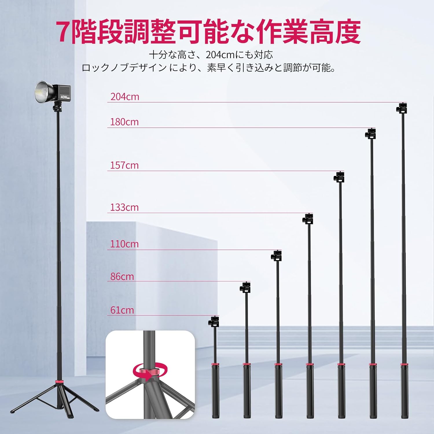 【より軽量で安定性UP】Ulanzi MT-79 ライトスタンドはアルミ製の脚スタンド、耐久性に優れた、脚直径が48cm、もっと丈夫です。三脚部に二重アルミ合金部品強化設計を加えたので、安定性が更に良くなります。また、足は滑り止めのゴムが付いて、床を傷つけることなく、地面をしっかりとグリップします。 【7段階伸縮のコンパクトなライトスタンド】ライトスタンドがは高さが7段調整可能で、最大200cmまでです。脚の開脚角度も調節でき、様々な撮影ニーズを実現します。重さは891g、36.5cmまで縮小して軽量とコンパクトで持ち運びに便利です。旅行、キャンプ、パーティー、屋外作業、写真撮影などに最適です。風の環境では揺れる可能性があります。ご使用の際はご注意ください。 【標準1/4"ネジコネクタ】三脚スタンドの上部には標準1/4"ネジスタッドが付属しています。前後180度調節できます。【シーン対応】主な撮影アクセサリにも適用。雲台、リング ライト、ビデオライトなど。フラッシュ、デジタルカメラ、ストロボ、スマホなどにも簡単に対応する。ご注意:本製品の最大負荷量は1Kgまで。 【製品リスト】リスト:MT-79ライト三脚スタンド*1。お買い上日より安心と信頼の1年保証期間がついております。万一初期不良品がございましたら、交換できます。 何かお困りのことがありましたら、ご連絡ください。 注:1.三脚を開き、三脚を押し下げる際は下限点を超えないよう注意してください。 押し過ぎると三脚を収納できなくなります。 無理に引き込むと破損の原因となります。2.1/4ネジのノブで締めた後、少し余裕を持って回転できるように設計されております。 【注意事項】: ・当店の商品は全て国内から配送されます。 ・国内配送の商品は国内でのお買い物と同じく消費税が発生いたします。関税はかかりません。 *色がある場合、モニターの発色の具合によって実際のものと色が異なる場合がある。