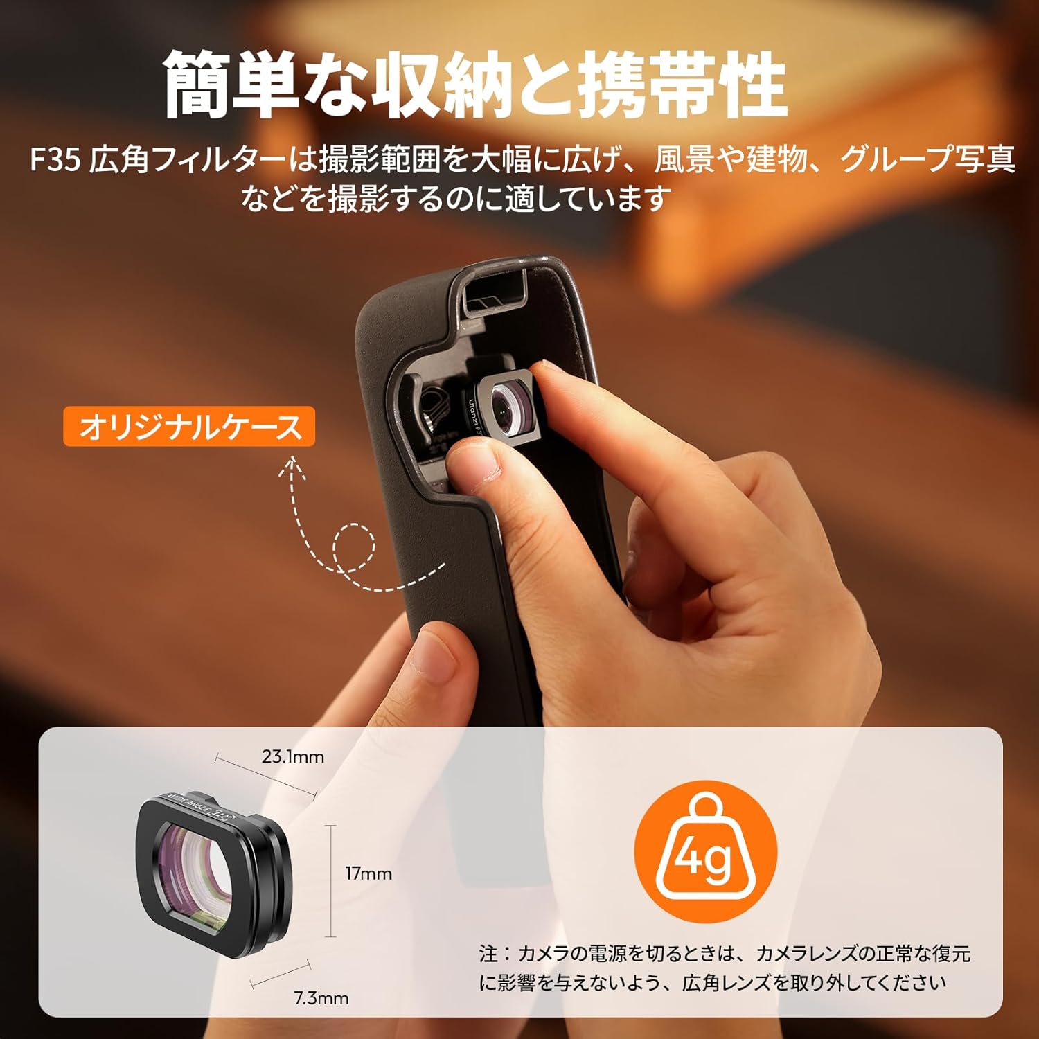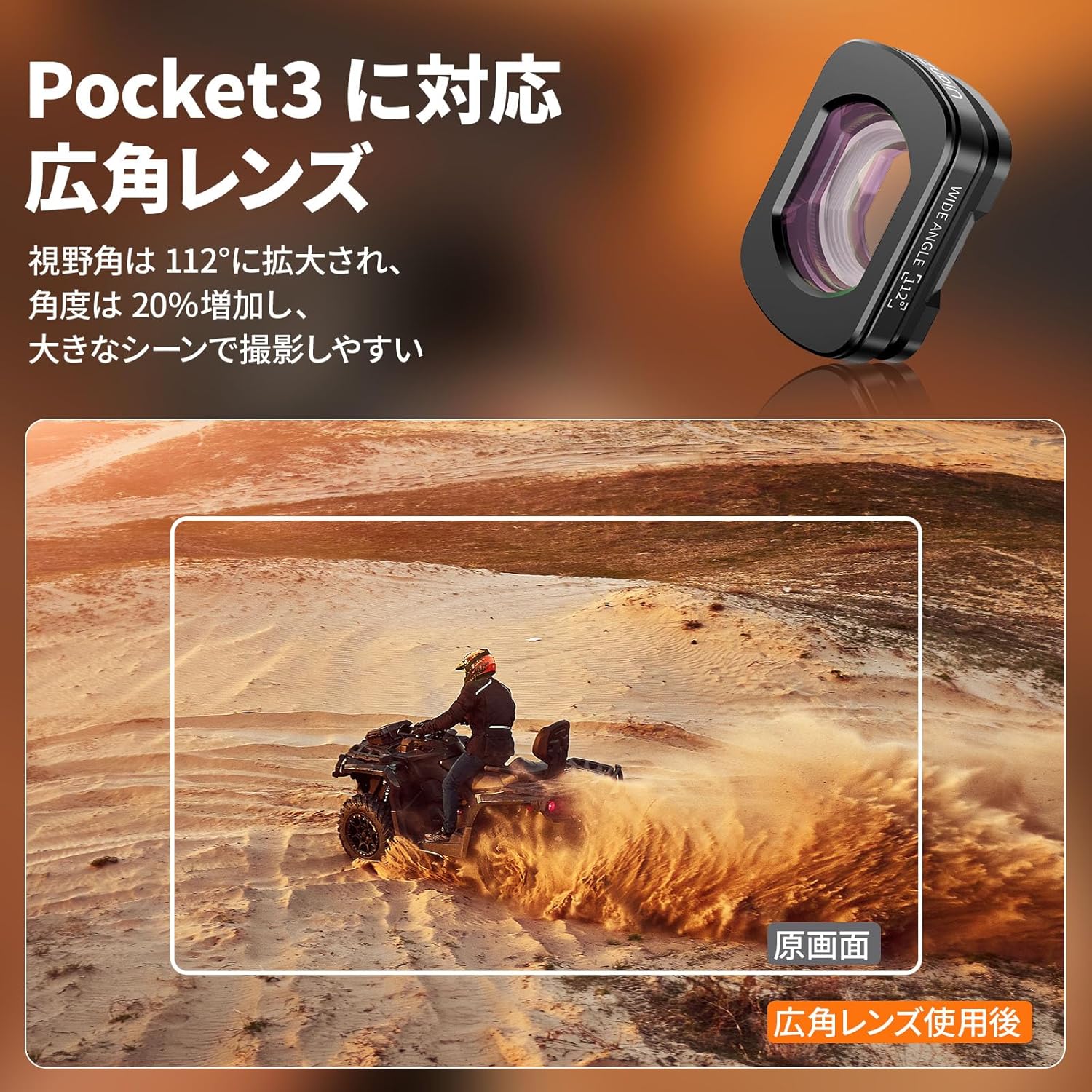 【広角画面】広角レンズをPocket3に装着して使用すると、視野角は112°に拡大され、角度は20%増加し、より広い画角で撮影できます。写真をより魅力的にします。*レンズの歪みの程度は-24°です。 【マグネット着脱式】Pocket3用フィルターはマグネット式スナップオン設計で、ワンタッチで素早いフィルター交換が可能。ジンバルのバランスを妨げないほど軽量です。自動フォローの使用時、屋外スポーツの撮影時、水平と垂直撮影の切り替え時にしっかりとしたグリップを提供します。 【簡単な収納と携帯性】オリジナル保護ケース上部のレンズスロットにフィットし、簡単に収納できます注:カメラの電源を切るときは、カメラレンズの正常な復元に影響を与えないよう、広角レンズを取り外してください 【光学ガラス】フィルターはHD光学ガラスのコーティングを施し、防水性、耐傷性、耐油性に優れ、お手入れが簡単です。高い光透過率、高精細画像、鮮やかな色彩の利点があります。また、明らかな歪み、まぶしさ、ゴーストはありません。 【軽量超薄型フレーム】これらの軽量フィルターは、精密 CNC 細工と超薄型アルミニウム製フレームで作られており、それぞれの重さはわずか4gで、ジンバルのキャリブレーションや保管に影響を与えることなく、ジンバルにシームレスにフィットします。 【注意事項】 ・当店の商品は全て国内から配送されます。 ・国内配送の商品は国内でのお買い物と同じく消費税が発生いたします。関税はかかりません。 ・色がある場合、モニターの発色の具合によって実際のものと色が異なる場合がある。