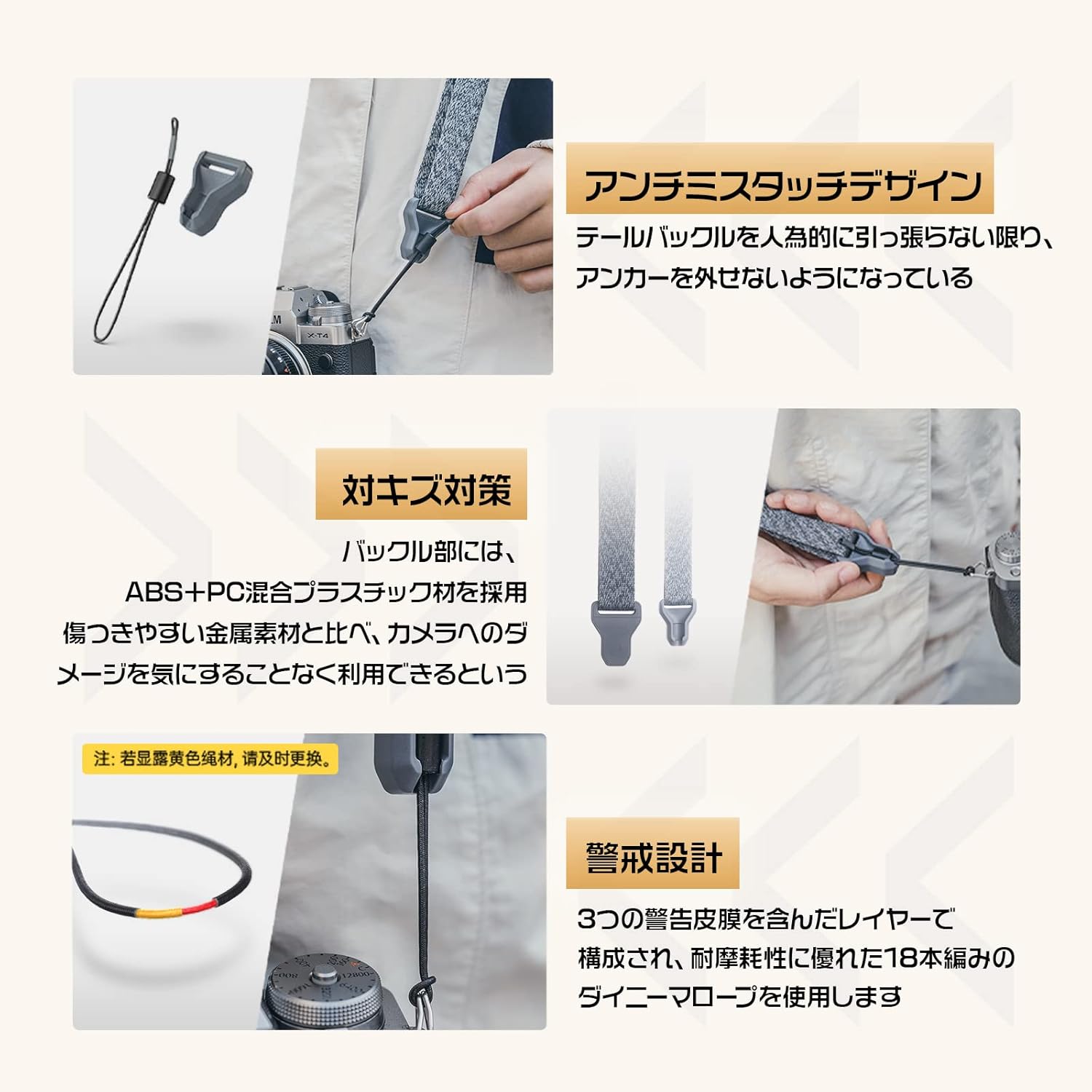 【長さ調節可能】このショルダーストラップは、速写ストラップにもなっています。ストラップには留め具が付いており、長さの調節が素早くできます。撮影しないときはストラップを締めることでカメラを体に密着させることができるので、カメラがブラブラせず移動がしやすい仕様になっています。撮影時は瞬時に伸ばして移行できます。アクティブに動き、瞬時のシャッターチャンスも逃したくないという撮影スタイルの方には、とても使い勝手がやすいなカメラストラップです。2WAYクイックプルアジャスターデザインにより、ストラップの長さを99〜145cmに調整できます。 【幅広い用途に対応】カメラストラップはさまざまな持ち運び方ができ、肩に掛けても首にぶら下げてもOKです。首や肩などに掛けられるため撮影時に持ち運びがしやすく、落下や盗難などのリスクも軽減できます。バックルはABS+PC混合プラスチック材質で作られています。熱可塑性樹脂は金属に比べてカメラへの当たりが柔らかく、傷がつく心配がない。*ショルダーストラップを購入する前に、カメラのサイズとストラップを取り付ける部分をよく確認することをお勧めします。ショルダーストラップがお使いのカメラに適合していることを確認してください。 【耐久性抜群】全長は145cm、ストラップの長さは99cm、幅は1.95cmです。重さは約75gです。PA66 (66ナイロン) ラップSBRソフトコットンエラステックを使用したストラップは、肌ざわりがよく、締め付け感がなく快適で、肩掛けの圧迫感を効果的に軽減する。また、接合部分には革素材を利用することで強度を確保し、軽くて摩擦に強い。表面が滑りにくく、肩からカメラを提げた際に安定しやすく、長時間カメラを持ち歩く場合にも適したショルダーストラップです。 【優れた耐荷重性】アンカー4個付きで、アンカー部の細いロープには耐摩耗性に優れた18本織りのダイニーマロープ(Dyneema)素材を使用し、最大60kgまでの荷重に耐えることができ、さまざまな機種のニーズに対応しています。重量のあるレンズを付けたミラーレスカメラや一眼レフカメラに最適なストラップです。品質保証:商品の品質には万全を期しておりますが、万が一不具合がございましたら、お気軽にメールで弊店にご連絡ください。24時間以内対応致します。品質に問題がある場合は交換できます。 【マグネット式クイックバックル】独自の「マグリンク」を採用しています。ハウジングの上部にショルダーストラップを取り付け、バックル部はカメラを装着します。マグネット式の接続方式で、カメラストラップをカメラから一瞬で取り外しできます。また、マグリンクの耐荷重が大きく、耐久性にもすぐれています。 注意:HasselbladX2Dカメラを使用する場合、購入前にカスタマーサービスに連絡してください。 このカメラの取り付け方法は他のカメラと異なるので、カスタマーサービスが正しい取り付け方法を説明します。 【注意事項】: ・当店の商品は全て国内から配送されます。 ・国内配送の商品は国内でのお買い物と同じく消費税が発生いたします。関税はかかりません。 *色がある場合、モニターの発色の具合によって実際のものと色が異なる場合がある。