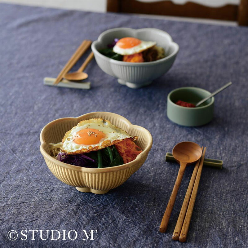 Ma Maisonオリジナルのキッチンシリーズとも相性の良い、食器やカトラリーをセレクトしております。 『STUDIO M'』 STUDIO Mでは商品をシリーズごとにそのデザインイメージに合った、土や釉薬を選んで制作しており、素材感を生かした、シンプルながらも味わいのある作りが魅力的なブランドです。中にはご使用に手間のかかるものもございますが丁寧にご使用頂ければ長くご愛用して頂ける安心の日本製の製品です。 フルロン 花形丼は、「花形装飾」という意味。梅の花を模した形はふっくらと愛らしく存在感があります。料理映えする華やかな丼で、旬の食材を使った料理を味わってほしいとの思いから制作。一番のこだわりは表面を覆う、職人の熟練の技が光る200本もの凹凸レリーフ。釉薬がかかった時にレリーフが最も美しく見えるよう彫りを深くデザインしました。透けた赤土の雰囲気が魅力的な色展開で、シンプルにまとまってしまいがちな丼ごはんも愛嬌のあるフルロンに盛り付ければわくわくしてきます。※サイズによって展開カラーが異なります。ご注意ください。 【5寸丼】 ・展開カラー:アメ ・ツヤのある表面感 【※白・グレーは生産終了となりました】 【5.5寸丼】 ・展開カラー:エクリュ・サブレ・アイスブルー ・ツヤの抑えられたマットな表面感 その他のSTUDIO Mの商品はこちらから 商品名 フルロン 花形丼 仕様 【5寸】約W156mm/ D153mm/ H74mm/ 580cc 【5.5寸】約W164mm/ D161mm/ H77mm/ 660cc 素材 5寸丼【グレー】陶器(赤土)/グレー釉/酸化【アメ】陶器(赤土)/アメ釉/酸化【白】陶器(赤土)/乳白釉/酸化5.5寸丼【エクリュ】陶器(赤土)/ 色マット釉/ 酸化【サブレ】陶器(赤土)/ 色マット釉/ 酸化【アイスブルー】陶器(赤土)/ 色マット釉/ 酸化素材の特性上、縁や角の部分に釉ムラや赤土の風合いがでます。 生産国 日本製 注意事項 電子レンジ可。 オーブン不可。 食洗機不可。 ・急激な温度変化は破損の原因となります。 ・冷凍食品を入れて急激な加熱や、冷蔵庫から出した器 を直ぐに火にかけたり、オーブンや電子レンジに 入れることはお避け下さい。 ・陶磁器は自然の土や焼成時の気温、湿度の変化に影響を 受けやすく、ひとつとして同じものを作ることはできません。 極力品質の均一化に務めておりますが、個々の色むらや、 蓋と身でばらつきが出ることがあります。 ・上絵を施してある商品は、金属たわしやクレンザー等 の研磨剤の使用をすると、上絵を傷つける場合があります。 ・ご購入時に表面にヒビ(貫入)が入っているものや 使用していくうちに貫入が入っていくものがあります。 ・素材、製造工程により商品によって以下の特性があります。 ●御本手(ごほんて)と呼ばれる淡い紅色の斑点 ●荒い土を使用しているため、縁に欠けたような跡 ●手作り(たたら成型)の部分的に引っ掻いたような線 ※写真の色合いについては、撮影環境等の問題から 多少実際の商品とは異なることがございます。 ご了承ください。STUDIO M'>プレート STUDIO M'>ボウル・お椀 STUDIO M'>小鉢 STUDIO M'>ポット・ミルクパン等 STUDIO M'>カトラリー STUDIO M'>ファブリック STUDIO M'>丼 STUDIO M'>その他
