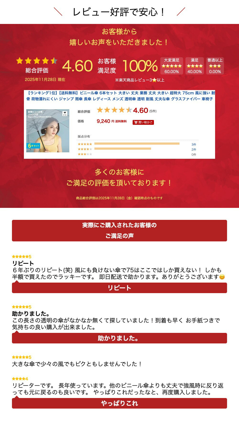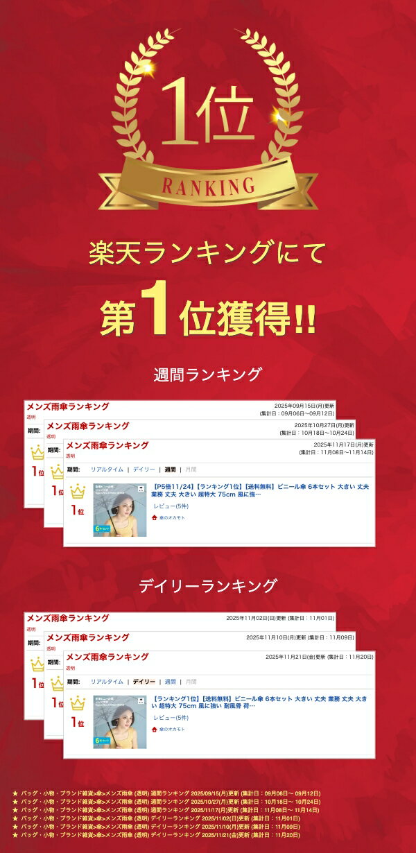 【商品説明】 ・ランキング1位獲得。 ・突然の雨に備えた耐風大きいビニール傘。 ・超ビッグサイズ75cmジャンプ式、6本セット。 ・2人用相合傘、車椅子、送迎、高身長の方、外国人の方に。 ・反返っても折れにくい丈夫グラスファイバー耐風骨。 ・持ち手と先端は黒の1色展開、骨組は黒。 ・地球環境にやさしい低公害POE生地を使用。 ・オフィスの置き傘などにも便利。 【シチュエーション】 ・会社、工場、car ディーラー、病院、薬局 オフィス関連。 ・介護施設、福祉施設、老人ホーム。 ・幼稚園、小学校、中学校、高校、大学、塾、専門学校。 ・ゲームセンター、パチンコ店、エンターテイメント施設。 ・キャンプ場など野外施設、ゴルフ場。 ・温泉地、行楽地、遊園地、観光地、ホテル。 ・神社、お寺。 ・飲食店、居酒屋、レストラン、クラブ。 【商品企画説明】 入り本数 6本 親骨の長さ 75cm 持ち手の色 黒 全長 98cm 開閉 ジャンプ式 生地の色 クリアー透明 生地の素材 ポリエチレン 1本の重量 約520g 生産地 中国 開いたときの直径 約126cm 【商品画像について】なるべく実物に近い状態になるように努力しておりますが、 光の具合やパソコンのモニターの種別、環境によっては見え方が実際のものと異なって見える場合もございますのでご了承ください。 関連商品ビニール傘 丈夫 70cm ビッグサイズ クリア 透明 周囲が見えや...【送料無料】ビニール傘 大きい 80cm 丈夫 透明 超特大 ビッグサ...990円3,980円【アルファベット無料名入で世界に一つだけの傘】【送料無料】傘 メンズ ...【送料無料】ビニール傘 大きい 75cm 丈夫 透明 超特大 ビッグサ...9,480円3,980円【送料無料】ビニール傘 プレゼント ギフト 実用的 誕生日 カード ギ...【送料無料】ビニール傘 まとめ買い 大きい クリアーとブラック2本組 ...1,980円2,980円【送料無料】ビニール傘 まとめ買い 6本 大きい 丈夫 70cm 反り...【ポイント10倍】【送料無料】傘 メンズ 日頃の感謝を込めて 父親 プ...7,920円3,980円【ランキング1位6冠達成】【送料無料】ビニール傘 まとめ買い 10本 ...【アルファベット無料名入で世界に一つだけの傘】【送料無料】折りたたみ傘...7,920円4,740円