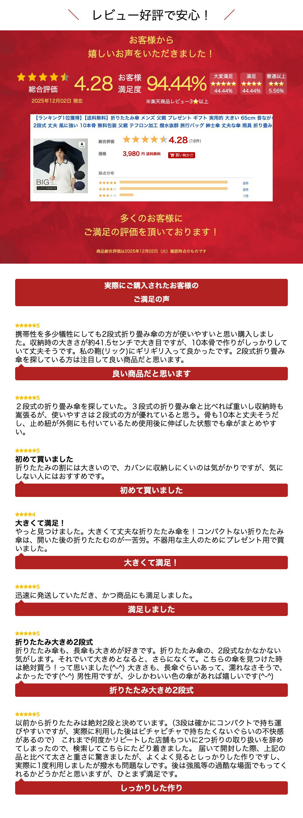 無料名入れご希望の方はこちら 【商品説明】 ・ランキング1位獲得。 ・メンズの折りたたみ傘。 ・昔ながらの2段式大きい65cm。 ・丈夫な10本骨。 ・無地ベーシックで使いやすい、合わせやすい、おしゃれ。 ・バックに1本入れておくと突然の雨にも便利。 ・ビジネスバッグ、学生カバン、旅行バッグにオススメ。 ・収納しやすい共袋付きの折りたたみ傘。 ・無料でラッピング包装、メッセージカードカード付、 末広がりで縁起がいい傘はプレゼントにオススメ。 【スタイル】 ・スーツのビジネスマン。 ・中学生、高校生の学生服。 ・普段着、カジュアルにもピッタリ。 【プレゼントギフトや記念日やイベントに】 母の日、父の日、誕生日、敬老の日、誕生日プレゼント 。 入学式、卒業式、歓迎会、送別会 。 パーティー、お祭り、バレンタインデー、ホワイトデー。 ハロウィン、結婚式、成人式、クリスマス、お中元、お歳暮。 そして自分へのご褒美、ごほうびにも。 【商品企画説明】 親骨の長さ 65cm 開閉 手開き式 生地の色 Navy紺Black黒 生地の素材 ポリエステル100% 1本の重量 約350g 生産地 中国 伸ばした状態の全長 72cm 畳んだ状態の全長 41.5cm 開いたときの直径 約112cm 【画像について】商品写真はなるべく実物に近い状態になるように努力しておりますが、 光の具合やパソコンのモニターの種別、環境によっては見え方が 実際のものと多少異なって見える場合もございますのでご了承ください関連商品【送料無料】折りたたみ傘 メンズ 父親 プレゼント ギフト 実用的 6...【送料無料】傘 メンズ 日頃の感謝を込めて 父親 プレゼント 実用的 ...3,980円3,980円【送料無料】傘 メンズ 父親 プレゼント ギフト 実用的 無地 シンプ...【送料無料】ビニール傘 大きい 80cm 丈夫 透明 超特大 ビッグサ...3,980円3,980円【スーパーセール25%OFF】【送料無料】折りたたみ傘 メンズ 父親 ...【スーパーセール50%OFF】【アルファベット無料名入で世界に一つだけ...1,480円4,740円【スーパーセール50%OFF】【アルファベット無料名入で世界に一つだけ...【スーパーセール50%OFF】【アルファベット無料名入で世界に一つだけ...3,740円4,740円【送料無料】ビニール傘 大きい 75cm 丈夫 透明 超特大 ビッグサ...【スーパーセール50%OFF】【送料無料】1000円ポッキリ 折りたた...3,980円1,000円