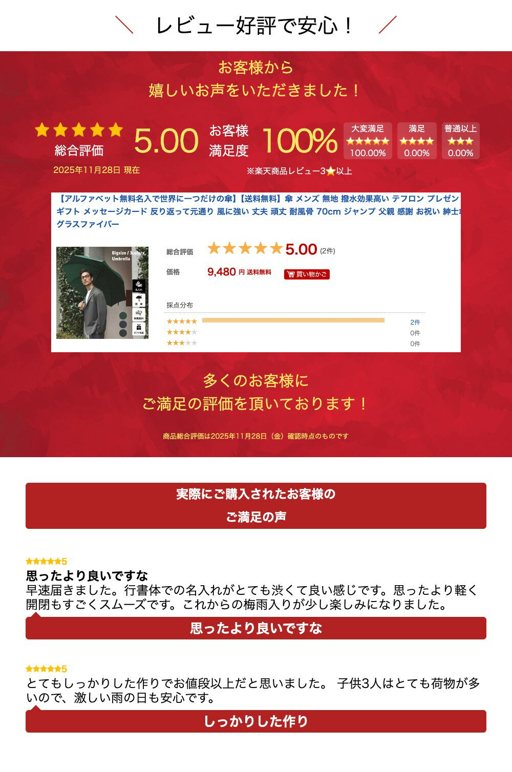 無料名入れ希望なしの方はこちら 【商品説明】 ・刺繍名入れで特別な1本に。 ・無地で使いやすい、合わせやすい、おしゃれ。 ・撥水効果抜群、デュポン社のテフロン加工生地。 ・グラスファイバー骨のため軽量でサビにくい、強くて丈夫。 ・耐風骨で反り返っても元通り、風に強い、丈夫。 ・ボタンはスナップボタンになります。 ・会社や工場、学校、専門学校の置き傘。 ・有料でラッピング包装、メッセージカードカード付、 末広がりで縁起がいい傘はプレゼントにオススメ。 【スタイル】 ・スーツのビジネスマン。 ・中学生、高校生の学生服。 ・普段着、カジュアルにもピッタリ。 【プレゼントギフトや記念日やイベントに】 母の日、父の日、誕生日、敬老の日、誕生日プレゼント 。 入学式、卒業式、歓迎会、送別会 。 パーティー、お祭り、バレンタインデー、ホワイトデー。 ハロウィン、結婚式、成人式、クリスマス、お中元、お歳暮。 そして自分へのご褒美、ごほうびにも。 【商品企画説明】 親骨の長さ 70cm 全長 91cm 開閉 ジャンプ式 生地の色 濃緑、紺、黒 生地の素材 ポリエステル100% 1本の重量 約560g 生産地 中国 開いたときの直径 約121cm 【商品画像について】なるべく実物に近い状態になるように努力しておりますが、 光の具合やパソコンのモニターの種別、環境によっては見え方が実際のものと異なって見える場合もございますのでご了承ください。関連商品【送料無料】傘 メンズ 父親 プレゼント ギフト 実用的 無地 シンプ...【ポイント10倍】【送料無料】傘 メンズ 日頃の感謝を込めて 父親 プ...3,980円3,980円【アルファベット無料名入で世界に一つだけの傘】【送料無料】傘 メンズ ...【送料無料】傘 メンズ キャンプ 迷彩柄 ミリタリー柄 ギフト プレゼ...4,740円2,980円【アルファベット無料名入で世界に一つだけの傘】【送料無料】折りたたみ傘...【アルファベット無料名入で世界に一つだけの傘】【送料無料】折りたたみ傘...4,740円9,480円【ランキング1位】【送料無料】ビニール傘 6本セット 大きい 丈夫 業...ビニール傘 丈夫 70cm ビッグサイズ クリア 透明 周囲が見えや...7,920円990円【送料無料】ビニール傘 大きい 80cm 丈夫 透明 超特大 ビッグサ...【送料無料】折りたたみ傘 メンズ 父親 プレゼント ギフト 実用的 6...3,980円3,980円