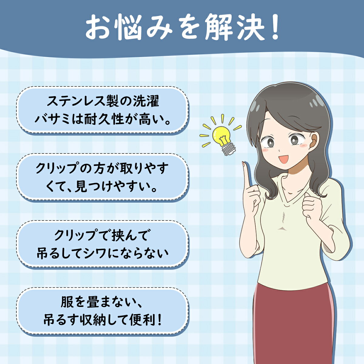 商品情報 【製品仕様】 製品名:洗濯バサミ カラー:シルバー・ブラック サイズ:縦10.5cm 材質:ステンレス セット:20個セット 【素敵な収納アイデア】 服を畳まない、吊るす収納して便利で忙しい日々の中でも、めんどくさい家事から解放してくれます!素敵な収納アイデアです。クリップの方が服などを取りやすくて、見つけやすいです。 【洗濯物を傷ませない】 留めた跡が付くのを避けて洋服と接地する部分に先端はプラスチック浸漬で作られ、丸みのデザインで大切なお洋服や布団などを守ります。 【優れた耐久性と耐水性】 ステンレスで作られて、雨や紫外線による劣化に強いです。錆びにくいため、雨の日、紫外線がつよい日にも室外のお洗濯物干しでも活躍します。 【安心と信頼の日本国内検品】 安心してご購入いただくために日本国内で丁寧に検品しております。万が一、初期不良などございましたら、お買い上げから30日以内にご連絡を頂ければ、交換・返品・返金を承ります。もしお届けした商品に問題があった場合には、お気軽にお問い合わせください。注意事項:モニターの発色により、実物と異なる場合がございます。