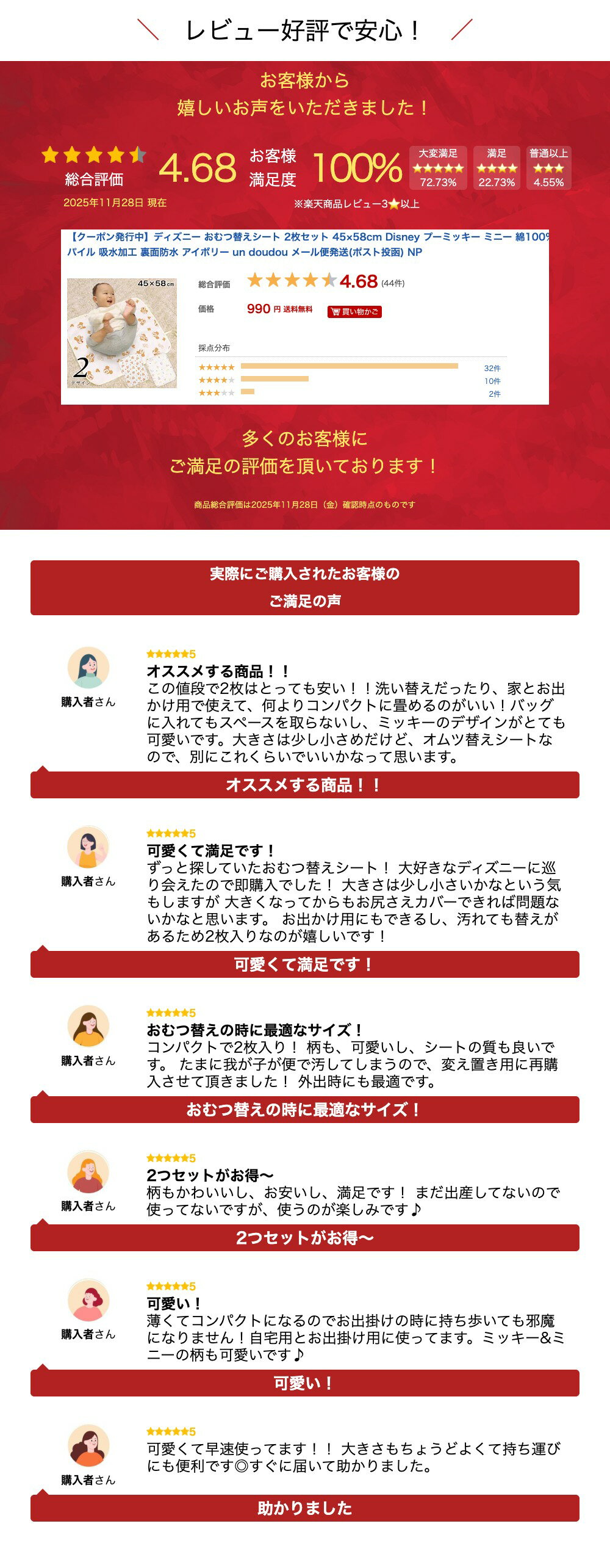 ©Disney ©Disney Based on the "Winnie the Pooh" works by A.A.Milne and E.H.Shepard. 《ディズニーベビー》 商品カテゴリ:おむつ替えシート 吸水加工 ディズニー Disney Mickey Minnie Pooh ミッキー ミニー プー 出産準備 防水 2枚組関連商品【クーポン発行中】ディズニー おむつ替えシート 2枚セット 45×58...【クーポン発行中】ディズニー おねしょ対策ケット ズボンタイプ Dis...【クーポン発行中】おむつ替えシート 2枚セット 45×58cm アニマ...990円990円890円【クーポン発行中】ディズニー あったか ベビー スリーパー フランネル...【クーポン発行中】ディズニー お昼寝 コットカバー 60×100cm ...【クーポン発行中】おむつ替えシート 2枚セット 45×58cm オーガ...990円990円790円【クーポン発行中】ディズニー ベビー 敷布団カバー 90×130cm ...【クーポン発行中】ディズニー ベビー 防水キルトパッド 60×90cm...【クーポン発行中】ディズニー ベビー 防水シーツ 60×90cm ミニ...1,590円890円890円【クーポン発行中】ディズニー ベビー フィッティングシーツ 日本製 6...【クーポン発行中】ディズニー お昼寝 コットカバー 60×130cm ...【クーポン発行中】ディズニー おねしょ対策ケット ズボンタイプ プー ...1,590円1,090円990円— 選べる2デザイン — 商品名 ディズニー おむつ替えシート (Mickey)(Pooh) 商品について 表面は吸水効果に優れたやさしい肌触りの綿100%パイル素材。裏面は防水仕様で漏れ対策もばっちり! サイドひも付きなので丸めてコンパクトにでき、お出かけ時にも最適です♪ 2枚組なので、洗い替え用にも。 愉快なミッキー&ミニーと、かわいいプーと仲間たちのデザイン! サイズ 45×58cm(サイドひも付き) 品 質 【表側】綿100%(パイル部分) ポリエステル100%(地糸) (裏側にポリウレタンラミネート加工) 【パイピング】ポリエステル80% 綿20% 生 産 中国 使用上のご注意 ・洗濯機(脱水機)で本製品を脱水すると、洗濯機(脱水機)が大きく揺れるなどの危険性がありますので、脱水はお避けください。 ※お持ちの洗濯機(脱水機)の取扱説明書も合わせて参照してください。 ・無蛍光洗剤をご使用ください。 ・ねじり又は絞りはお避けください。 ・洗濯取り込みの際は、物干し竿と防水加工面(裏面)が密着し、加工面がはがれる可能性がありますので、取り扱いには十分ご注意ください。 ・色落ちすることがありますので、他の物と分けて洗ってください。 ・洗濯後、放置すると色移りや色落ちの原因となりますので、ご注意ください。 ・染料の性質上、使用時の摩擦により色落ちすることがありますのでご注意ください。 ・乾燥機はご使用できません。