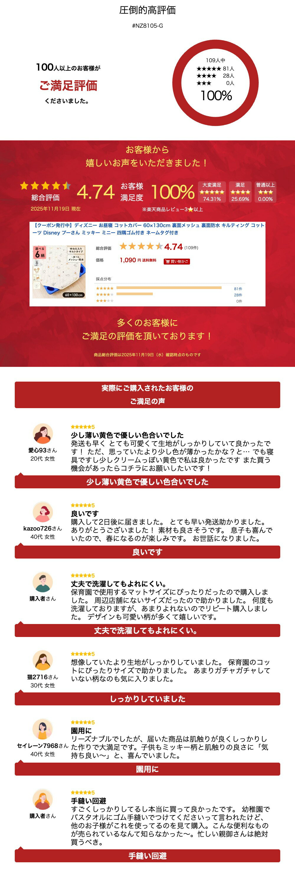 ★☆★ コットカバーは全部で3サイズ ★☆★ ▶ 60×100cm 小さいサイズはこちらから ▶ 60×130cm ふつうサイズはこちらから ▶ 60×150cm 大きいサイズはこちらから ©Disney ©Disney Based on the "Winnie the Pooh" works by A.A.Milne and E.H.Shepard. 《ディズニーベビー》 《保育園 コットカバー 60 130》 商品カテゴリ:コットカバー 60×130cm 60_130 ネームタグ おひるね 午睡コット コットシーツ コットベッドカバー 敷布団カバー 中わた入り キルティング キルトパッド 表面パイル地に吸水加工 吸水効果 男の子 女の子 子ども 子供 こども キッズ 保育園 幼稚園 入園 通園 入園準備 ジュニア寝具 園児寝具 ウォッシャブル 洗える ホルムアルデヒド検査 キャラクター:Disney ディズニー Mickey ミッキー Minnie ミニー Donald ドナルドダック Daisy デイジーダック Mickey&Friends ミッキー&フレンズ Winnie the Pooh くまのプーさん Baby Pooh ベビープー Piglet ピグレット Tigger ティガー Eeyore イーヨー 黄色 イエロー クリーム アイボリー ベージュ 総柄 おしゃれ かわいい 《ディズニーベビー》 《保育園 コットカバー 60 130》 関連商品【クーポン発行中】ディズニー お昼寝 コットカバー 60×100cm ...【クーポン発行中】ディズニー あったか お昼寝 コットカバー 60×1...【クーポン発行中】ディズニー お昼寝 コットカバー 60×150cm ...990円990円1,290円【クーポン発行中】お昼寝 コットカバー 60×130cm 裏面メッシュ...【クーポン発行中】お昼寝 コットカバー 60×130cm 裏面メッシュ...【クーポン発行中】ディズニー お昼寝 コットカバー 60×130cm ...1,090円1,090円790円【クーポン発行中】お昼寝 コットカバー 60×130cm 吸水速乾 裏...【クーポン発行中】6重ガーゼ お昼寝 コットカバー 日本製 60×13...【クーポン発行中】ディズニー お昼寝 コットカバー 60×100cm ...990円3,490円690円【クーポン発行中】お昼寝 コットカバー 60×130cm 裏面メッシュ...【クーポン発行中】お昼寝 防水コットカバー 60×130cm 北欧アニ...【クーポン発行中】お昼寝 冷感コットカバー 60×130cm 裏面メッ...1,490円990円1,690円- design variation - 商品名 ≪ディズニー≫コットカバー【裏面メッシュ】【裏面防水】 (Pooh&Friends)(Mickey・Minnie)(Mickey Mouse)(Baby Pooh) (プー&フレンズ)(ミッキー・ミニー)(ミッキーマウス)(ベビープー) 商品について ディズニーデザインが選べるコットカバーです。さらに、裏面を「通気性の良いメッシュタイプ」と「水分を漏らさない防水タイプ」の2種類からお選びいただけます。 保育園に便利な名前が書けるネームタグ付き。丸洗いできるため、お洗濯もラクチンです♪ サイズ 60×130cm※キルティング製許容範囲+5%、-3% 品 質 【表側】 ・《A》《B》パイル地 綿100%(パイル部分)※吸水加工 ポリエステル100%(地糸) ・《C》《D》《E》ピーチスキン生地 ポリエステル100%※吸水加工 ・《F》 ポリエステル65%・綿35% 【中綿】 リエステル100% 【裏側】 《メッシュタイプ》ポリエステル100% 《防水タイプ》裏側にポリウレタンラミネート加工 生 産 中国 使用上のご注意 【裏面メッシュタイプ】 ・無蛍光洗剤をご使用ください。 ・洗濯で色落ちすることがありますので、他の物と分けて洗ってください。 ・洗濯後、放置すると色移りや色落ちの原因となりますので、放置することなく、形を整えて陰干ししてください。 ・染料の性質上、使用時の摩擦により色落ちすることがありますのでご注意ください。 ・乾燥機で乾燥した場合、縮む恐れがありますので、お避けください。 【裏面防水タイプ】 ・洗濯機(脱水機)で本製品を脱水すると、洗濯機(脱水機)が大きく揺れるなどの危険性がありますので、脱水はお避けください。 ※お持ちの洗濯機(脱水機)の取扱説明書も合わせて参照してください。 ・無蛍光洗剤をご使用ください。 ・ねじり又は絞りはお避けください。 ・洗濯取り込みの際は、物干し竿と防水加工面(裏面)が密着し、加工面がはがれる可能性がありますので、取り扱いには十分ご注意ください。 ・色落ちすることがありますので、他の物と分けて洗ってください。 ・手洗い後、放置すると色移りや色落ちの原因となりますので、ご注意ください。 ・染料の性質上、使用時の摩擦により色落ちすることがありますのでご注意ください。 ・乾燥機、脱水機はご使用出来ません。