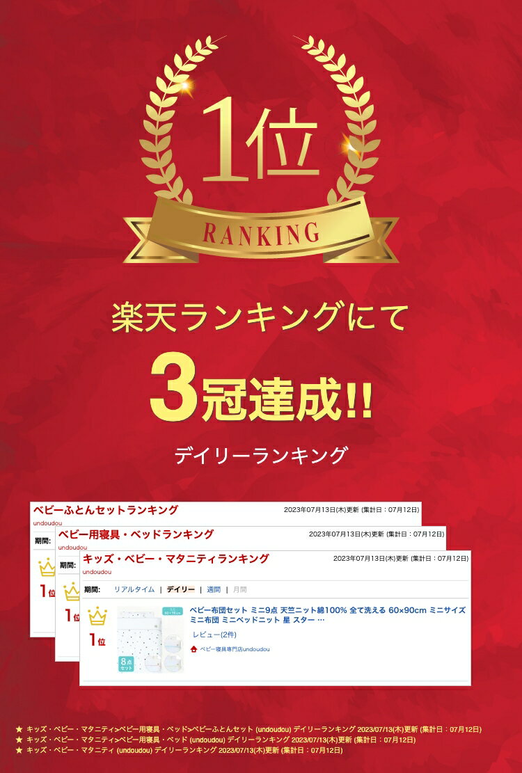 SPEC 【1】ミニ掛布団カバー<サイズ:80×105cm> ■中国製 綿100%(天竺ニット) 【2】ミニ掛布団中芯<サイズ:75×100cm> ■中国製 側生地/ポリエステル65%・綿35% 中綿/ポリエステル100% 【3】枕カバー<サイズ:25×42cm> ■中国製 綿100%(天竺ニット) 【4】枕中芯<サイズ:21×31cm> ■中国製 側生地/ポリエステル65%・綿35% 中綿/ポリエステル100% 【5】ミニ固綿敷布団<サイズ:60×90cm(厚み約5.5cm)> ■側生地:中国製 中綿:日本製 側生地・中綿/ポリエステル100% 【6】ミニフィッティングシーツ<サイズ:60×90cm> ■中国製 綿100%(天竺ニット) 【7】ベビー枕<21×18cm> ■中国製 側生地/綿100%(天竺ニット) 中身/ポリエチレン樹脂 【8】ミニ防水キルトパッド<サイズ:60×90cm> ■中国製 表側:綿100%(天竺ニット) 中綿:ポリエステル100% (裏側ポリウレタンラミネート加工) 内寸サイズが長さ90cm×幅60cmのベビーベッドに対応しています。 ▼ベビーベッドをご使用される方は確認ください▼ 内寸70×120cmのレギュラーサイズベビーベッドをご使用の場合はレギュラー布団をご注文ください ▶▶ レギュラーサイズのお布団を見る ▶▶ お布団セットについての「よくある質問」は こちらをタッチしてご確認ください ギフトラッピングを選択された場合、当店で受注後にラッピング料金150円(税込)を加算させていただきます。予めご了承ください。 《ベビー布団セット ミニ》 関連商品【クーポン発行中】ベビー布団セット ミニ8点 オーガニックコットンニッ...【クーポン発行中】ベビー布団セット ミニ8点 オーガニックコットンダブ...【クーポン発行中】ベビー布団セット 8点 オーガニックコットンニット ...5,990円5,990円6,990円【クーポン発行中】ベビー布団セット 8点 天竺ニット 綿100% 全て...【クーポン発行中】ベビー布団セット 8点 オーガニックコットンダブルガ...おねしょケットプレゼント★MAX10%OFFクーポン/日本製 ベビー布...6,990円6,990円7,990円おねしょケットプレゼント★MAX10%OFFクーポン/日本製 ベビー布...ディズニー お昼寝布団セット シンプル3点セット/フルセット8点 綿1...ディズニー お昼寝布団 保育園 3点セット 70×120cm くまのプ...7,990円4,990円4,990円【クーポン発行中】ベビー 肌布団カバー 兼用お昼寝掛布団カバー+中芯 ...おねしょケットプレゼント★MAX10%OFFクーポン/日本製 ベビー布...お昼寝布団セット シンプル3点セット/フルセット8点 綿100% 洗え...6,090円9,990円3,990円