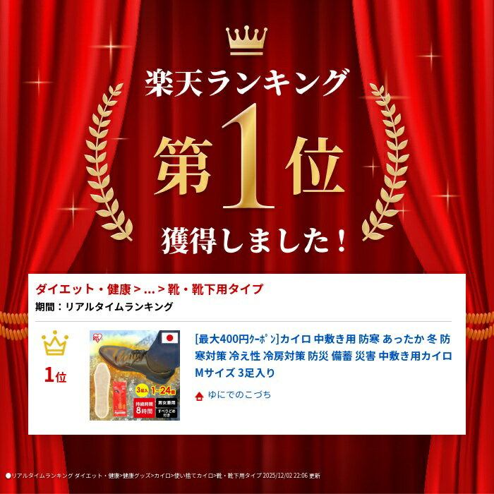 足の裏全体が温かくなる、くつの中に敷くタイプのカイロ[Mサイズ]です。すべり止め付きです。●内容量3足入り●商品サイズ(cm)幅約7.1×奥行約20(カイロ1枚あたり)●最高温度44度(※くつの中での使用を想定した測定値です。)●平均温度36度●持続時間約8時間(※くつをぬいだ時は高温になり、持続時間は短縮します)●材質鉄粉、水、活性炭、バーミキュライト、塩類、高吸水性樹脂●原産国日本(検索用:カイロ 中敷き用 防寒 あったか 冬 防寒対策 冷え性 冷房対策 防災 備蓄 災害 4582228250482)最強翌日配送対象商品に関するご案内 最強翌日配送対象商品・対象地域に該当する場合は最強翌日配送マークがご注文カゴ近くに表示されます。 最強翌日配送可能なお支払方法は【クレジットカード、代金引換、全額ポイント支払い】のみとなります。 下記の場合は最強翌日配送対象外となります。 ・15点以上ご購入いただいた場合 ・時間指定がある場合 ・ご注文時備考欄にご記入がある場合 ・決済処理にお時間を頂戴する場合 ・郵便番号や住所に誤りがある場合 ・最強翌日配送対象外の商品とご一緒にご注文いただいた場合 ・お届け先住所文字数が40文字以上の場合 関連キーワード(本商品の説明ではありません)母の日 父の日 敬老の日 こどもの日 クリスマス バレンタイン ホワイトデー ハロウィン お正月 成人の日 成人式 記念日 誕生日 卒業式 入学式 お歳暮 お中元 春 夏 秋 冬 梅雨 節分 ひな祭り 七夕 十五夜 初詣 年越し 夏祭り 花火大会 結婚祝い 内祝い 出産祝い 快気祝い 還暦祝い 古希 喜寿 傘寿 米寿 卒寿 白寿 百寿 新築祝い 引っ越し祝い 開店祝い 開業祝い 就職祝い 昇進祝い 合格祝い 銀婚式 金婚式 七五三 長寿祝い 御礼 お母さん お父さん 義母 義父 祖父 祖母 おばあちゃん おじいちゃん 娘 息子 彼氏 彼女 恋人 友達 上司 先輩 後輩 同僚 キッズ 子供 幼児 ベビー 赤ちゃん 育児 学生 社会人 シニア 10代 20代 30代 40代 50代 60代 70代 80代 90代 一人暮らし 単身赴任 主婦 主夫 新生活 家族暮らし 子育て 旅行 トラベル ライブ ホームパーティ ビジネス 法人 ギフト プレゼント男女兼用サイズのページです 他サイズはこちら 男女兼用 Lサイズ