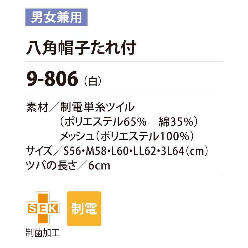 八角帽子たれ付 男女兼用 飲食店 ユニフォーム 厨房 調理 住商モンブラン MONTBLANC 9-806